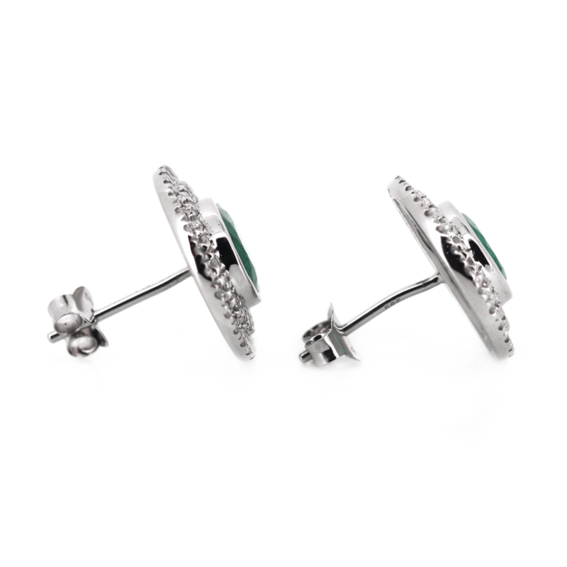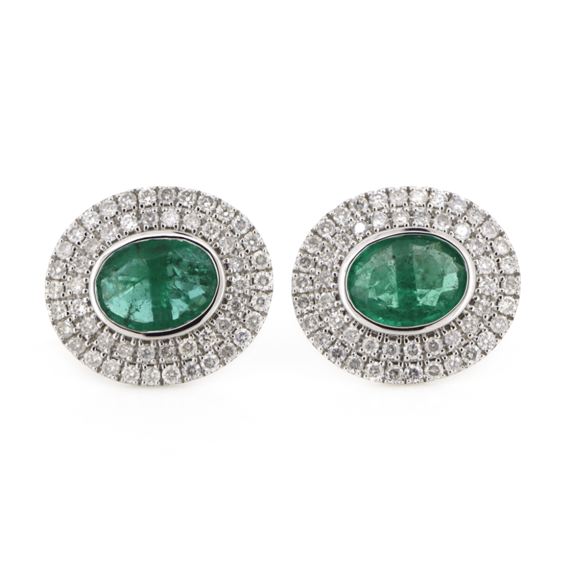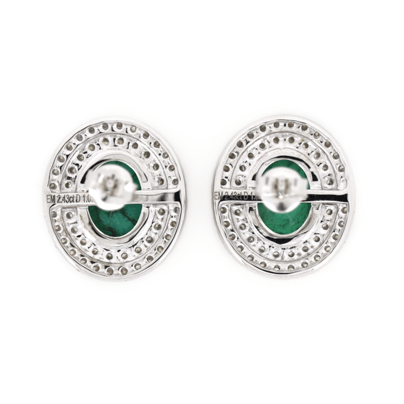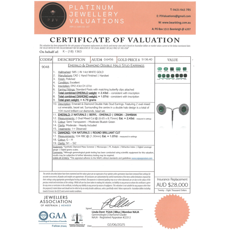 14K White Gold, Emerald And Diamond, Double Halo Stud Earrings. The Centres Feature, 2 Oval Cut, Moderate Bluish-Green, Emeralds (2.43Ct Tsw, Moderate-Heavy Inclusions, Enhanced), Bezel Set. Surrounding The Centres In Double Halos Are, 104 Round Brilliant Cut, Diamonds (1.07Ct Tdw, G-H Colour, Si1-Si2 Clarity), Micro-Bead Set. The Earrings Have Post Backs, With Butterfly Clasps.