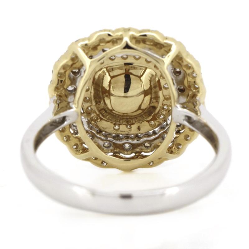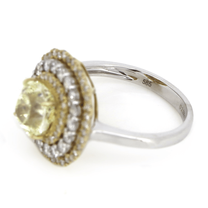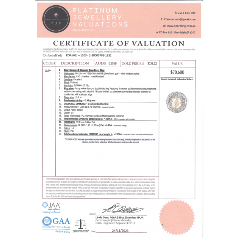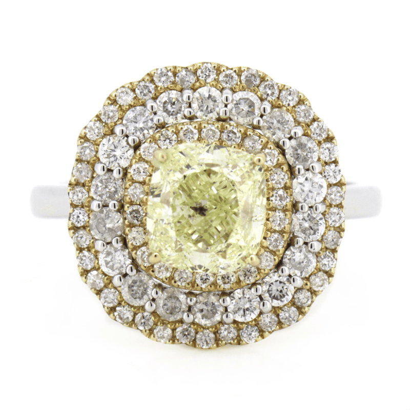 14K WHITE/YELLOW GOLD, FANCY YELLOW DIAMOND, TRIPLE HALO RING. The Centre Features, One Cushion Cut, Fancy Yellow, Diamond (2.006Ct, Si1 Clarity), 4 Claw Set. Encompassing The Centre Are, 78 Round Brilliant Cut, Diamonds (0.75Ct Tdw, H-K Colour, P2+ Clarity), Claw Set In Yellow/White Gold. Ring Size M 1/2. 14K White/Yellow Gold, Fancy Yellow Diamond, Triple Halo Ring. The Centre Features, One Cushion Cut, Fancy Yellow, Diamond (2.006Ct, Si1 Clarity), 4 Claw Set. Encompassing The Centre Are, 78 Round Brilliant Cut, Diamonds (0.75Ct Tdw, H-K Colour, P2+ Clarity), Claw Set In Yellow/White Gold. Ring Size M 1/2. Jewellery Valuations Provided By A Third Party Professional Not Directly Associated With Lloyds Auctions at AUD $70,600.00This Insurance Valuation has been provided by a registered Jewellery Valuer and is intended for insurance purposes only. The valuation amount has no bearing on the auction value of the item. Any questions regarding the valuation should be directed to the issuing Valuer (refer to contact details on the certificate) as Lloyds have no association or relationship with the Valuer or the valuation amount contained within the valuation. Condition: NEW 0645883+5094
