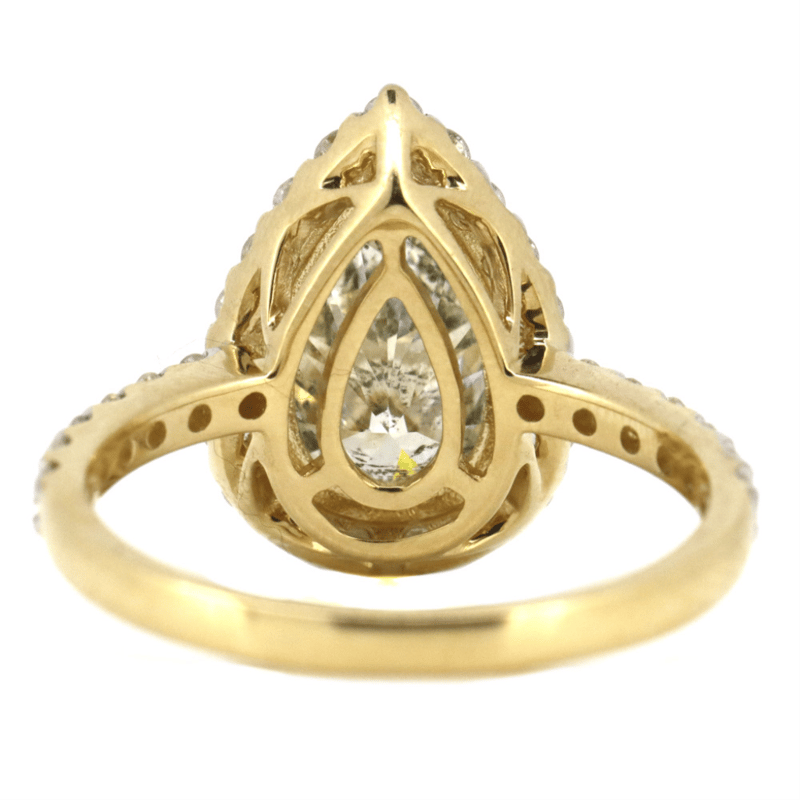 14K Yellow Gold And Diamond, Halo Ring. The Centre Features, One Pear Modified Brilliant Cut, Light Fancy Yellow, Diamond (2.02Ct, Tlb Colour, P2 Clarity), Claw Set. Surrounding The Centre In A Halo And Decorating The Band Are, 31 Round Brilliant Cut, Diamonds (0.65Ct Tdw, G-H Colour, Si1-Si2 Clarity, 1.70Mm), Pip-Claw Set. Ring Size M 1/2.