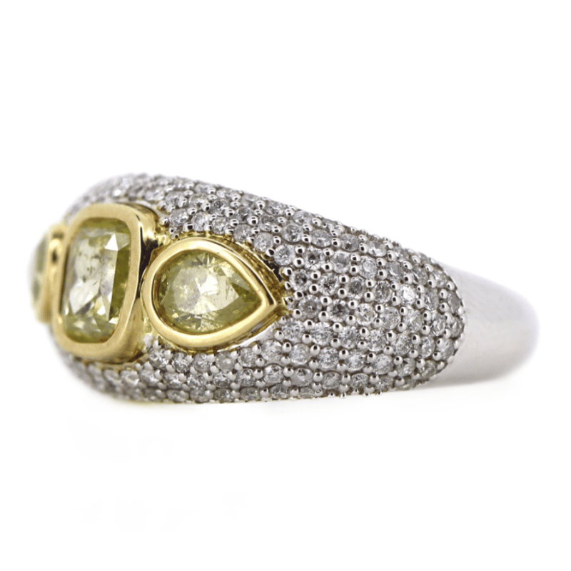 14K YELLOW/WHITE GOLD AND YELLOW/WHITE DIAMOND, STATEMENT RING. The Central Design Features, 1 Cushion Modified Brilliant Cut And 2 Pear Modified Brilliant Cut, Strong Fancy Yellow, Diamonds (1.52Ct Tdw, P1-P2 Clarity), Bezel Set. Surrounded By, 168 Round Brilliant Cut, Diamonds (0.66Ct Tdw, H-K Colour, P2+ Clarity), Micro-Bead Set. Ring Size M. 14K Yellow/White Gold And Yellow/White Diamond, Statement Ring. The Central Design Features, 1 Cushion Modified Brilliant Cut And 2 Pear Modified Brilliant Cut, Strong Fancy Yellow, Diamonds (1.52Ct Tdw, P1-P2 Clarity), Bezel Set. Surrounded By, 168 Round Brilliant Cut, Diamonds (0.66Ct Tdw, H-K Colour, P2+ Clarity), Micro-Bead Set. Ring Size M. Jewellery Valuations Provided By A Third Party Professional Not Directly Associated With Lloyds Auctions at AUD $38,000.00This Insurance Valuation has been provided by a registered Jewellery Valuer and is intended for insurance purposes only. The valuation amount has no bearing on the auction value of the item. Any questions regarding the valuation should be directed to the issuing Valuer (refer to contact details on the certificate) as Lloyds have no association or relationship with the Valuer or the valuation amount contained within the valuation. Condition: NEW 0645883+5052