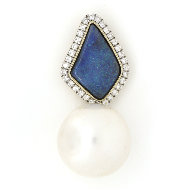 The Design Features, One Round, White, Cultured South Sea Pearl (15.00Mm Size, Ab Quality, Good Lustre), Set As The Lower Drop. Accompanied By, One Cabochon Cut, Lightening Ridge Opal (35.66Ct, Dark Blue, Floral Pattern) Bezel Set. Surrounded By, 32 Round Brilliant Cut, Diamonds (0.39Ct Tdw, G-H Colour, Si2-P1 Clarity), Bead Set.