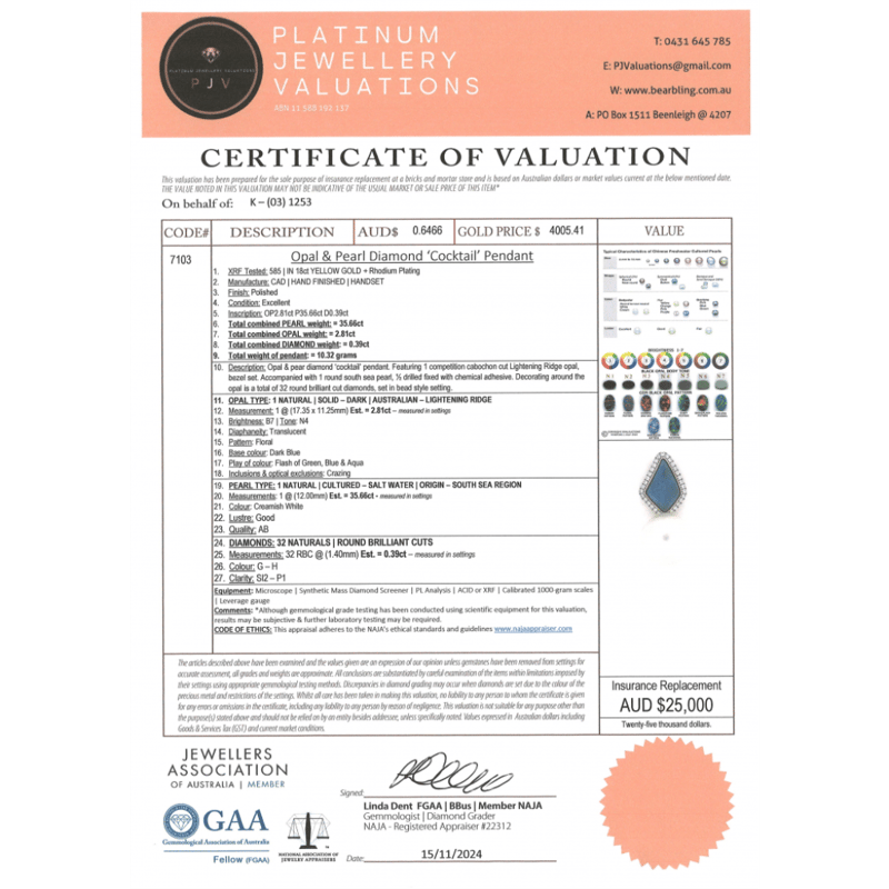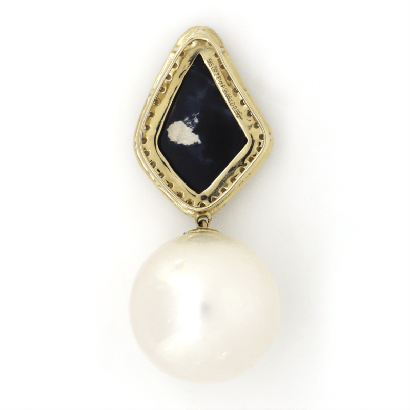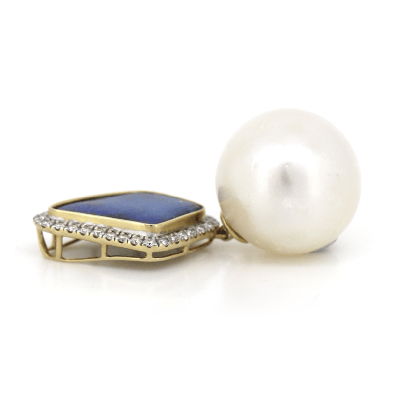 14K Yellow Gold, White Cultured South Sea Pearl, Lightening Ridge Opal And Diamond, Drop Pendant. The Design Features, One Round, White, Cultured South Sea Pearl (15.00Mm Size, Ab Quality, Good Lustre), Set As The Lower Drop. Accompanied By, One Cabochon Cut, Lightening Ridge Opal (35.66Ct, Dark Blue, Floral Pattern) Bezel Set. Surrounded By, 32 Round Brilliant Cut, Diamonds (0.39Ct Tdw, G-H Colour, Si2-P1 Clarity), Bead Set.