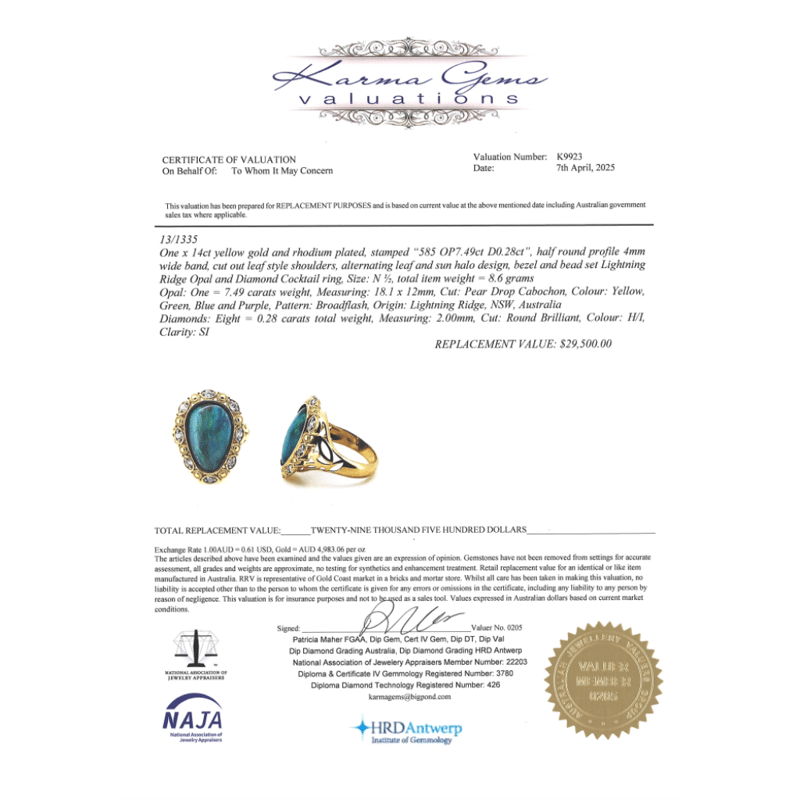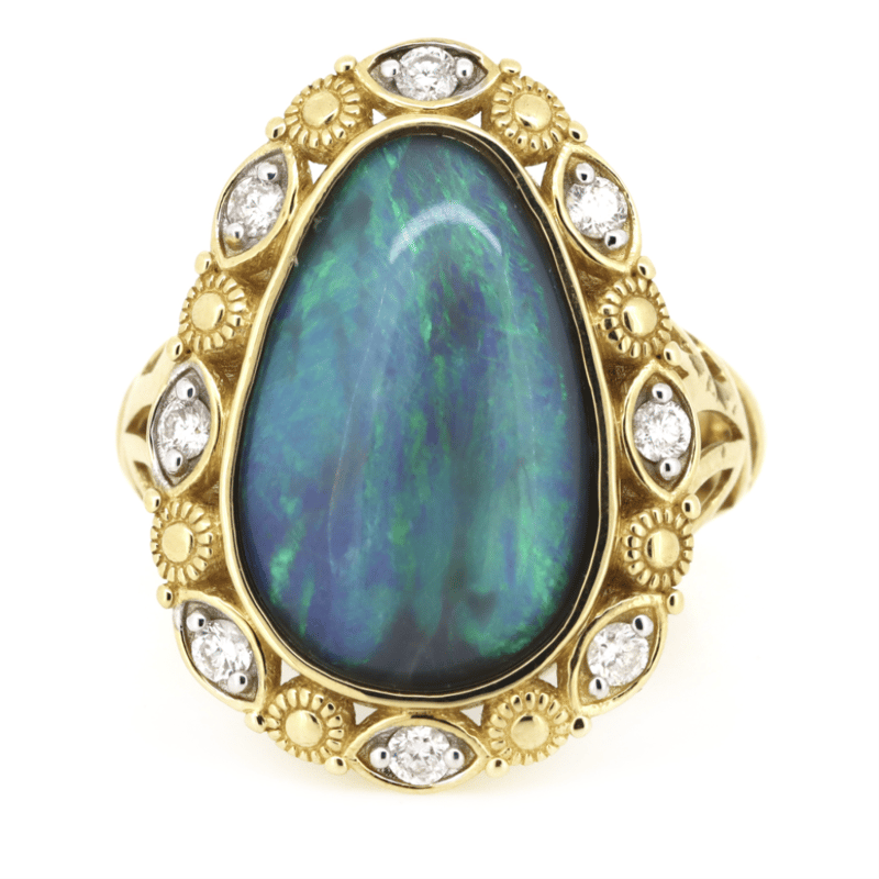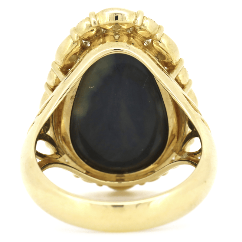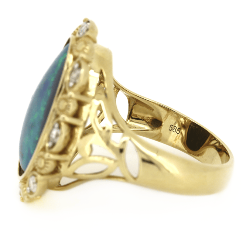 14K Yellow Gold, 7.49Ct Lightning Ridge Opal And Diamond, Statement Ring. The Centre Features, Pear Drop Cabochon Cut, Lighting Ridge Opal (7.49Ct, Yellow, Green, Blue And Purple, Colour Play), Bezel Set. Surrounding The Centre In A Halo Are, 8 Round Brilliant Cut, Diamonds (0.28Ct Tdw, H-I Colour, Si Clarity), Claw/Bezel Set. Ring Size O 1/2.