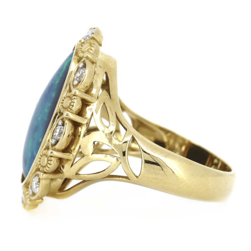 14K YELLOW GOLD, 7.49CT LIGHTNING RIDGE OPAL AND DIAMOND, STATEMENT RING.