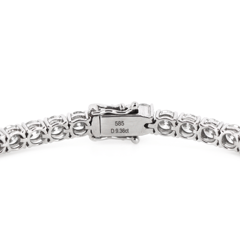 14K White Gold And 9.36Ct Tdw Diamond, Tennis Bracelet. The Design Features, 48 Round Brilliant Cut, Diamonds (9.36Ct Tdw, H-I Colour, Si1-Si2 Clarity), 4 Claw Set. The Bracelet Has A Box Lock Clasp. Bracelet Length Is 17.5Cm.