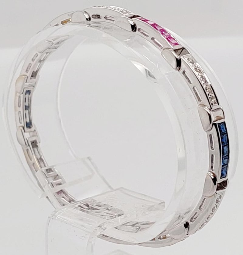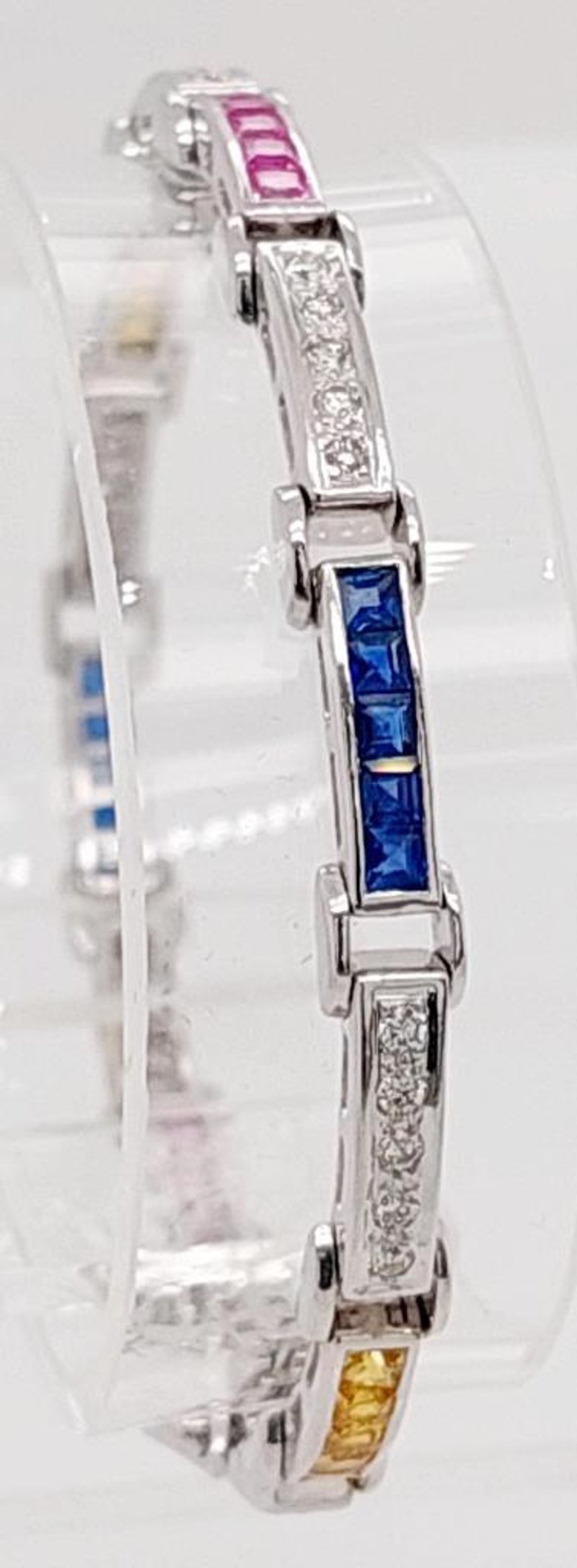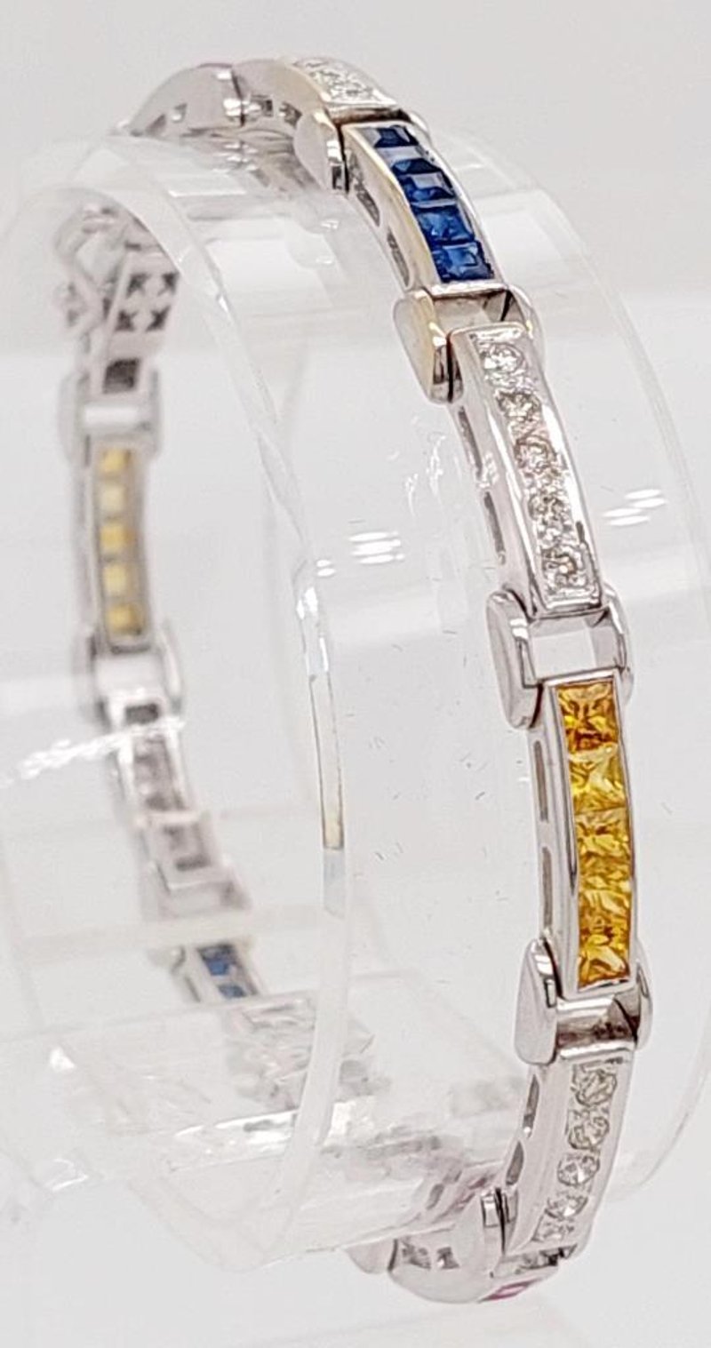 18CT WHITE GOLD SAPPHIRE AND DIAMOND SET BRACELET Total Item Weight: 13.6gms Size: 15.5cms This 18Ct White Gold Bracelet With A Box Clasp And Figure Eight Safety Catch Features Thirty (30) X Channel Set Princess Cut Pink, Yellow And Blue Sapphires, 1.80Ct In Total Combined Weight And Measuring Approx. 2.2Mm X 2.2Mm X 1.34Mm And Thirty (30) X Bead Set Round Brilliant Cut Diamonds, 0.60Ct In Combined Weight, Measuring 1.75Mm X 1.75Mm, Vs2-Si1 In Clarity And I In Colour. Jewellery Valuations Provided By A Third Party Professional Not Directly Associated With Lloyds Auctions at AUD $5028 This Insurance Valuation has been provided by a registered Jewellery Valuer and is intended for insurance purposes only. The valuation amount has no bearing on the auction value of the item. Any questions regarding the valuation should be directed to the issuing Valuer (refer to contact details on the certificate) as Lloyds have no association or relationship with the Valuer or the valuation amount contained within the valuation. Condition: Excellent- Refer Images 0 162901+24 CROSSDOCK