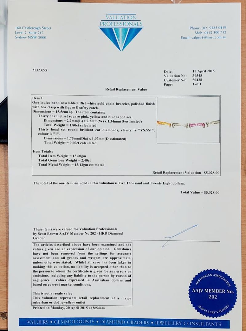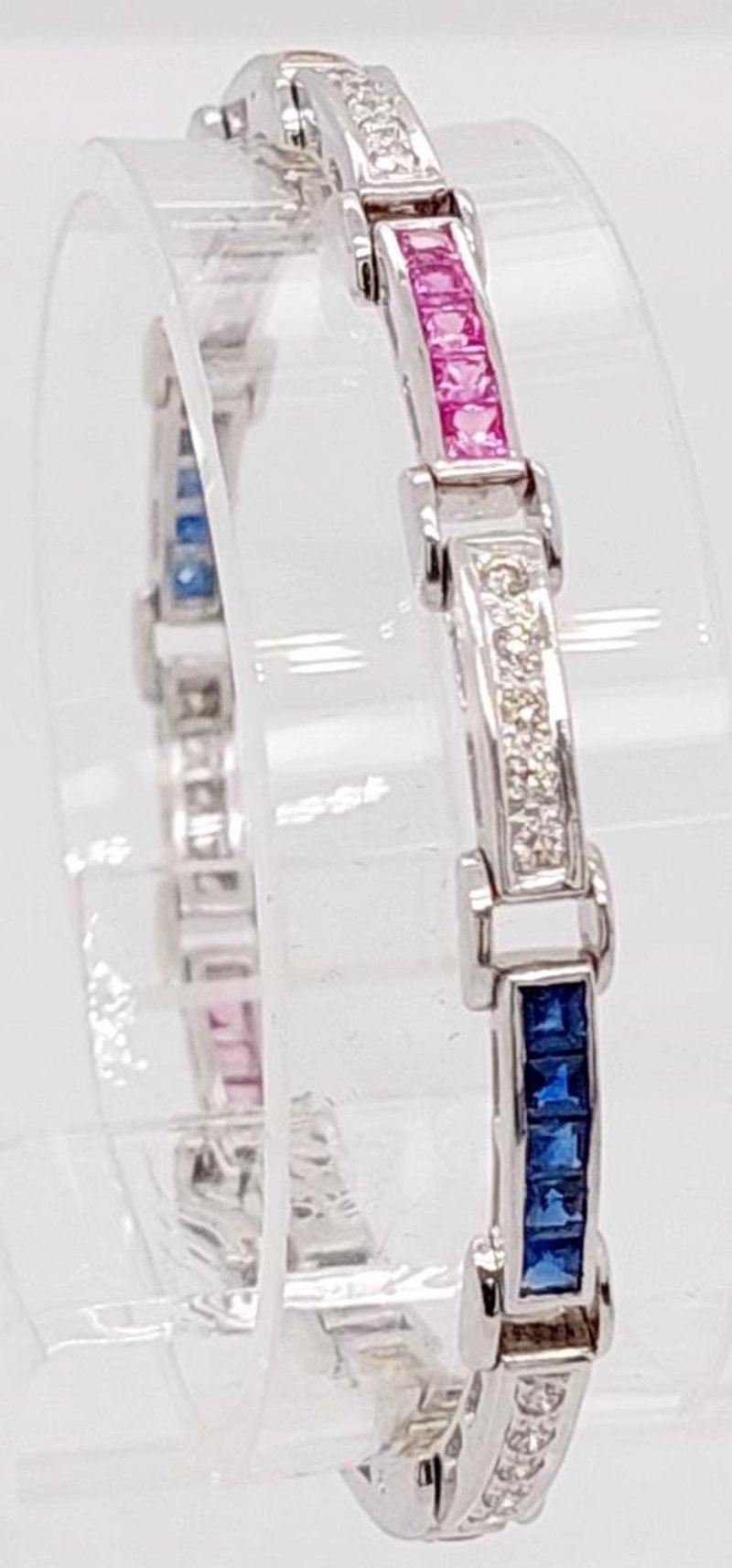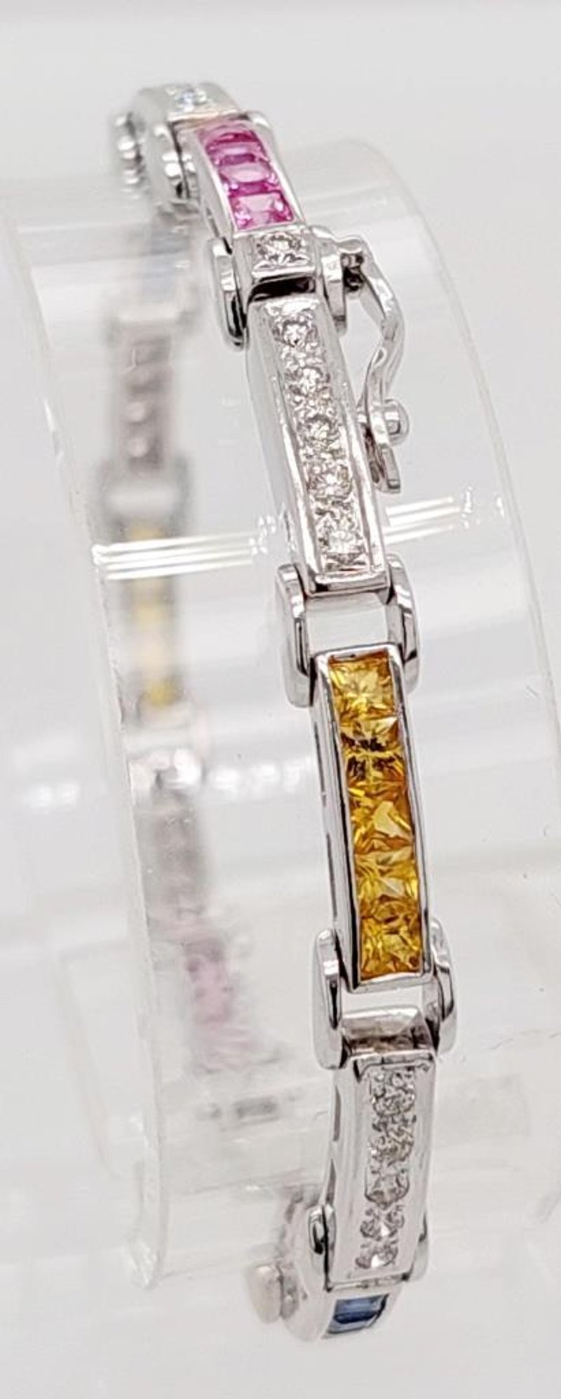18CT WHITE GOLD SAPPHIRE AND DIAMOND SET BRACELET Total Item Weight: 13.6gms Size: 15.5cms This 18Ct White Gold Bracelet With A Box Clasp And Figure Eight Safety Catch Features Thirty (30) X Channel Set Princess Cut Pink, Yellow And Blue Sapphires, 1.80Ct In Total Combined Weight And Measuring Approx. 2.2Mm X 2.2Mm X 1.34Mm And Thirty (30) X Bead Set Round Brilliant Cut Diamonds, 0.60Ct In Combined Weight, Measuring 1.75Mm X 1.75Mm, Vs2-Si1 In Clarity And I In Colour. Jewellery Valuations Provided By A Third Party Professional Not Directly Associated With Lloyds Auctions at AUD $5028 This Insurance Valuation has been provided by a registered Jewellery Valuer and is intended for insurance purposes only. The valuation amount has no bearing on the auction value of the item. Any questions regarding the valuation should be directed to the issuing Valuer (refer to contact details on the certificate) as Lloyds have no association or relationship with the Valuer or the valuation amount contained within the valuation. Condition: Excellent- Refer Images 0 162901+24 CROSSDOCK