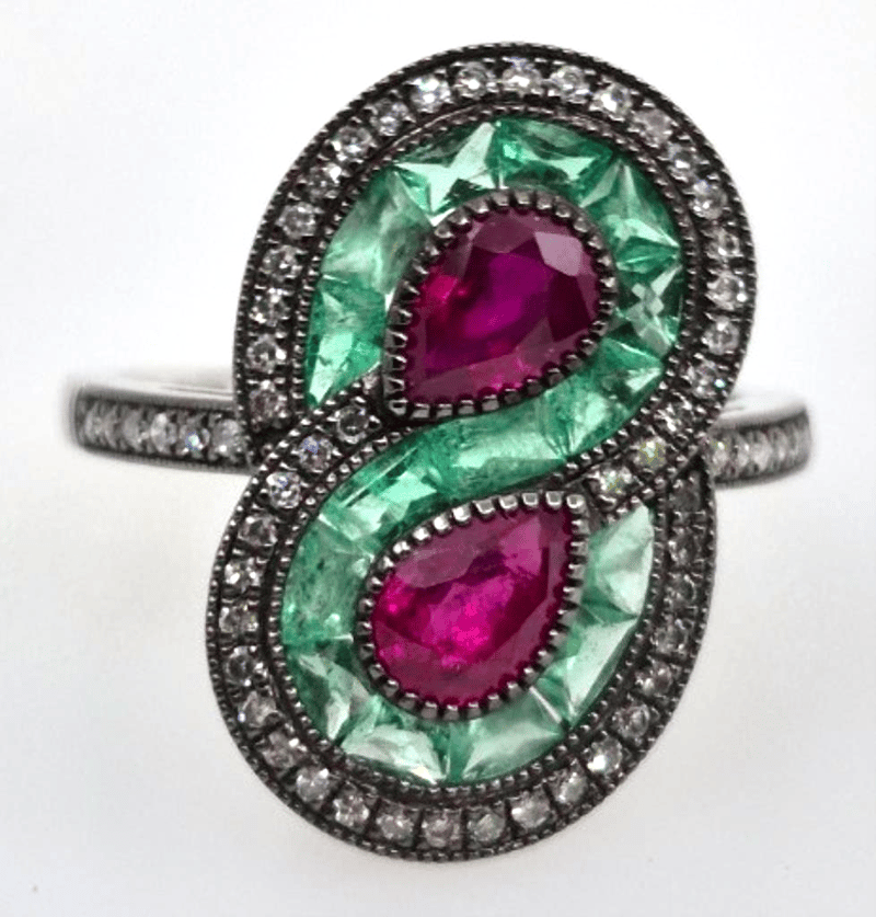 Featuring 2 Pear Shape Rubies 1.72Tcw. 15 Channel Set Emeralds 2.18 Tcw And 58 Pave Set Diamonds 0.63Tcw