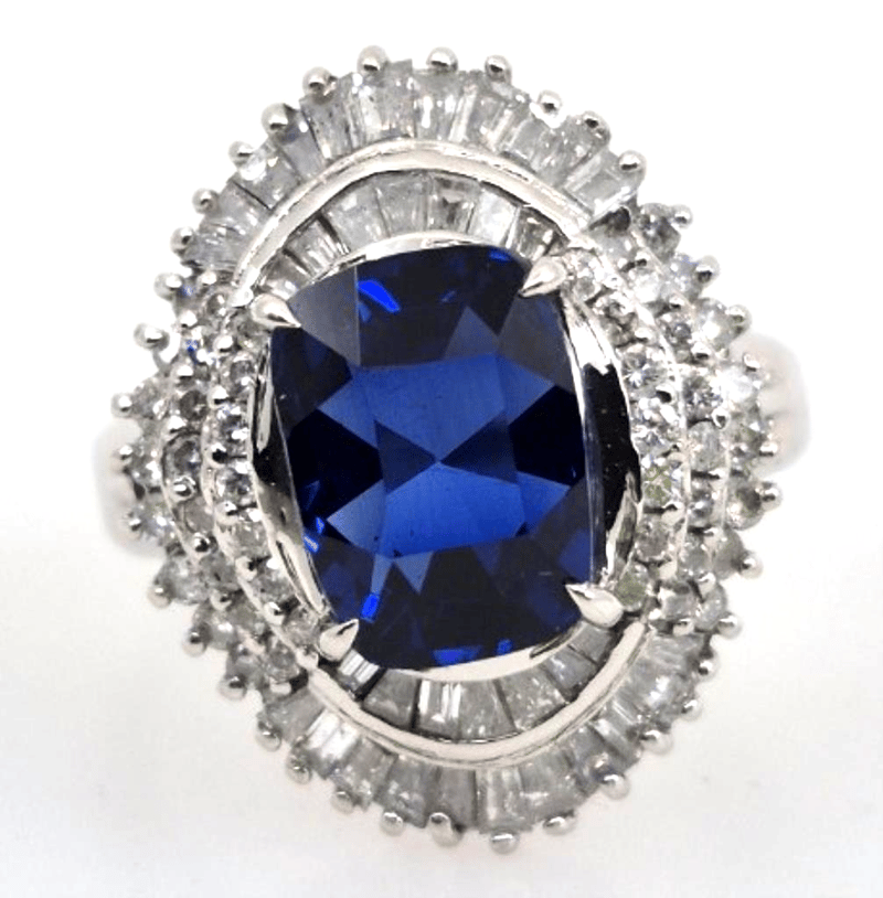 Featuring 1 Cushion Shape Ceylon Sapphire 3.85Cts. Surrounded By 36 Claws Set Baguettes And 44 Claws Set Of Brilliant Cut Diamonds 1.53 Tcw