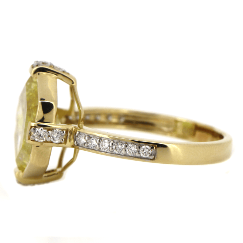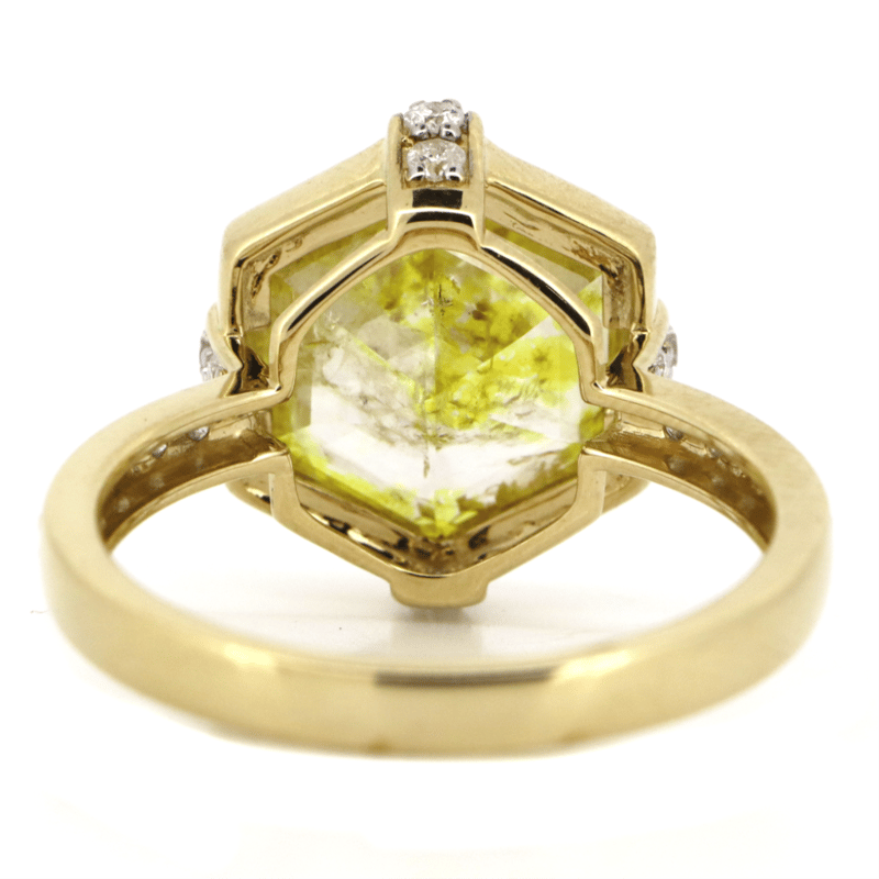 The Centre Features, One Hexagonal Cut, Yellow Diamond (4.06Ct Tdw, I1-2) Claw Set. Encompassing The Claws And Shoulders Are, 20 Round Brilliant Cut, Diamonds (0.24Ct Tdw, H Colour, Si-I1 Clarity), Bezel Set. Ring Size M 1/2.
