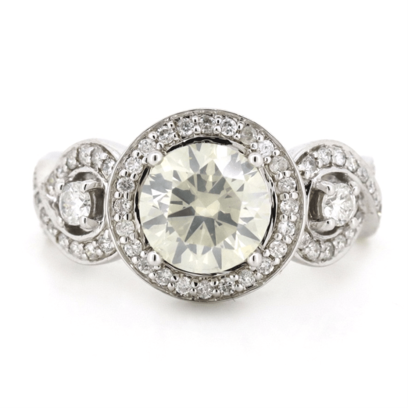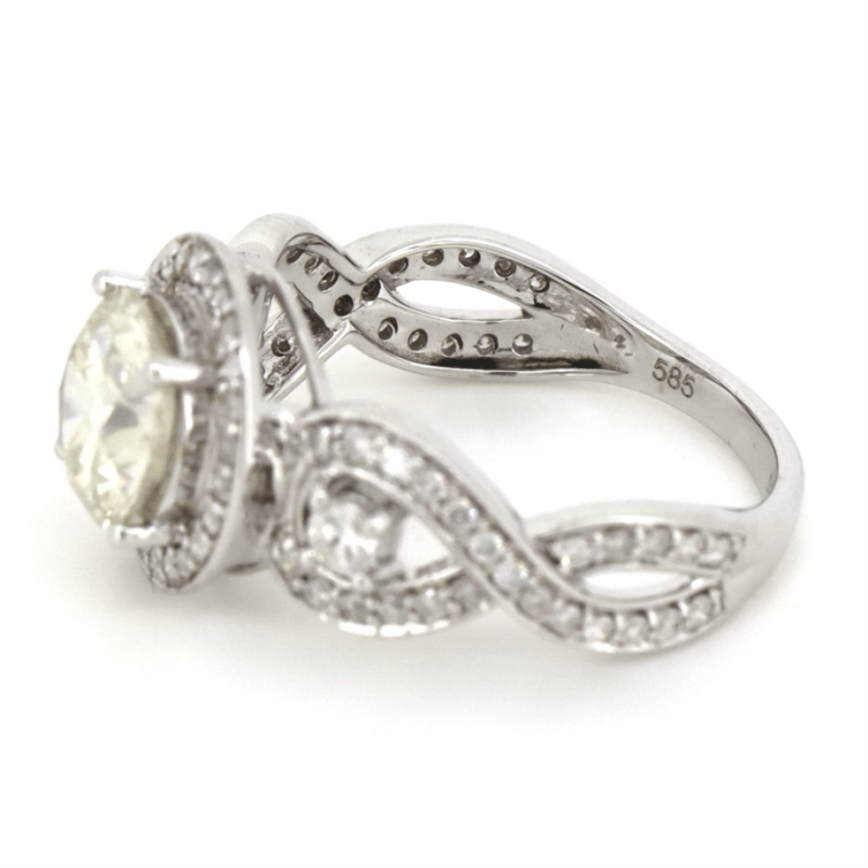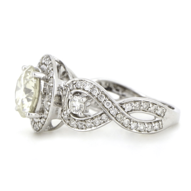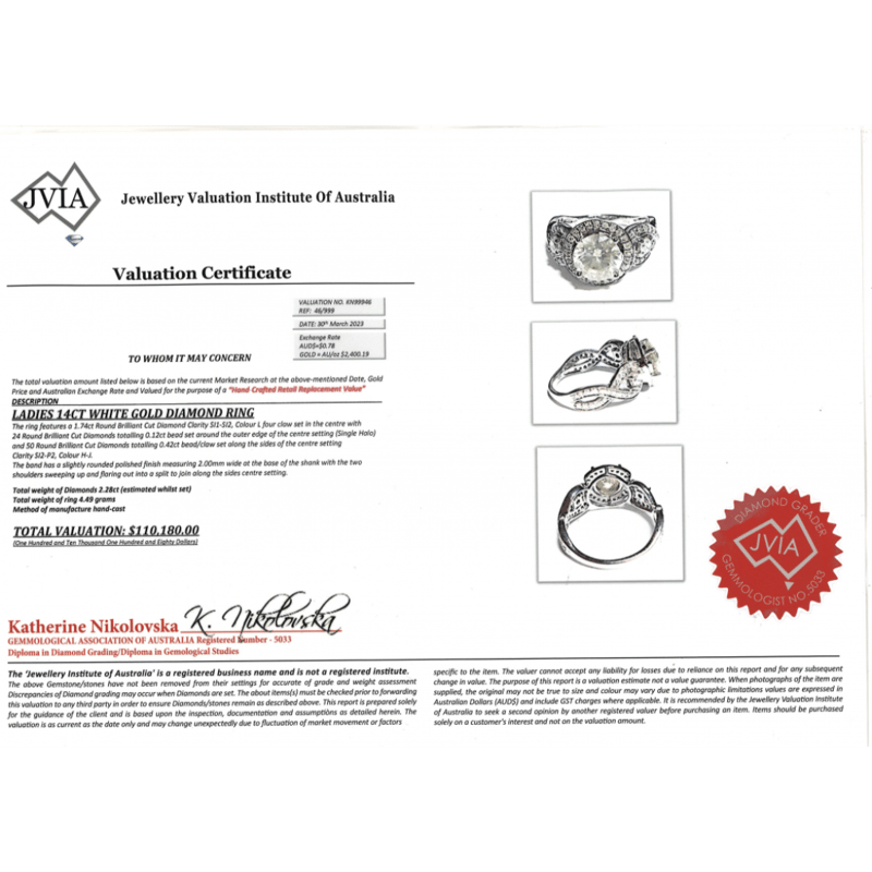14K WHITE GOLD AND DIAMOND, HALO TWIST BAND RING. The Centre Features, One Round Brilliant Cut, Diamond (1.74Ct Tdw, L Colour, Si1-Si2 Clarity), 4 Claw Set. Encompassing The Centre Are, 74 Round Brilliant Cut, Diamonds (0.54Ct Tdw, H-J Colour, Si2-P2 Clarity), Bead/Claw Set. Ring Size N 1/2. Jewellery Valuations Provided By A Third Party Professional Not Directly Associated With Lloyds Auctions at AUD $110,180.00This Insurance Valuation has been provided by a registered Jewellery Valuer and is intended for insurance purposes only. The valuation amount has no bearing on the auction value of the item. Any questions regarding the valuation should be directed to the issuing Valuer (refer to contact details on the certificate) as Lloyds have no association or relationship with the Valuer or the valuation amount contained within the valuation. CONDITION: GOOD 0645892+5141