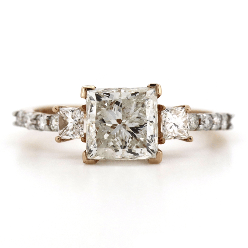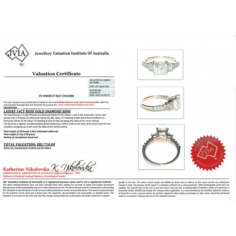 The Centre Features, One Princess Cut, Diamond (2.13Ct Tdw, I-J Colour, P1-P2 Clarity), 4 Corner Claw Set. Flanking Either Side Of The Centre Are, 2 Princess Cut, Diamonds (0.20Ct Tdw, H-I Colour, Si1-Si2 Clarity), Claw Set. Decorating The Band Are, 8 Round Brilliant Cut, Diamonds (0.12Ct Tdw, I-K Colour, P1-P2 Clarity), Claw Set. Ring Size M 1/2.