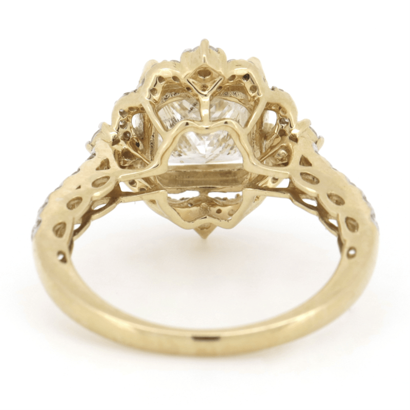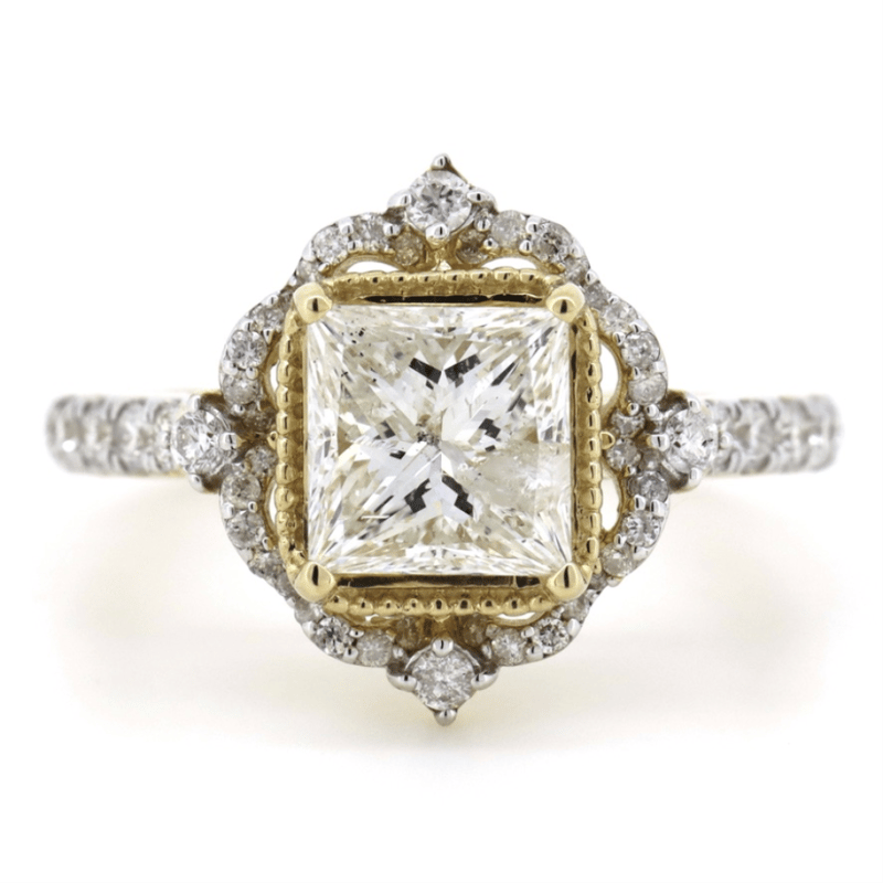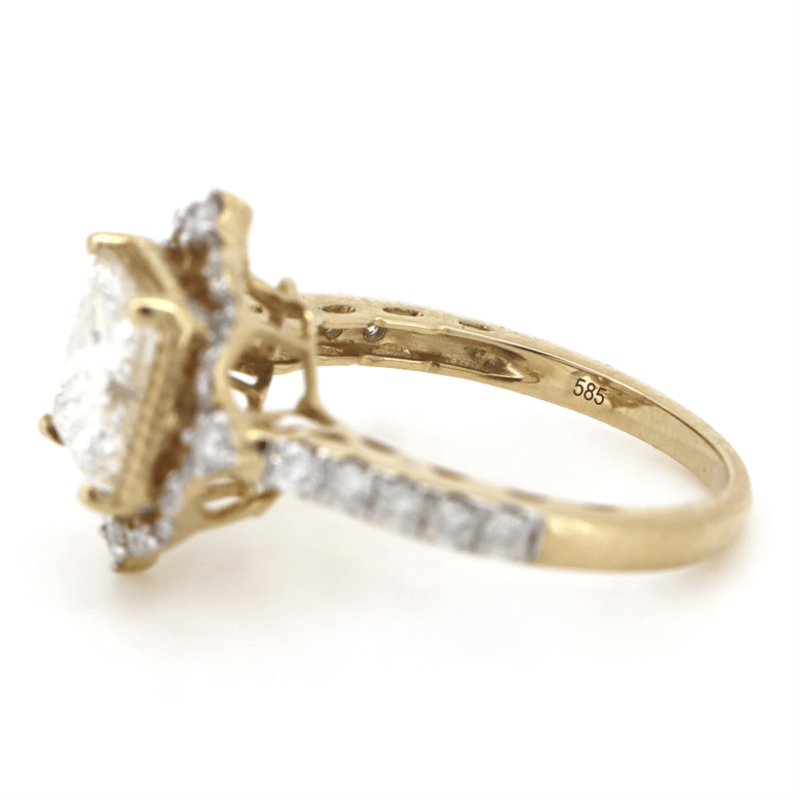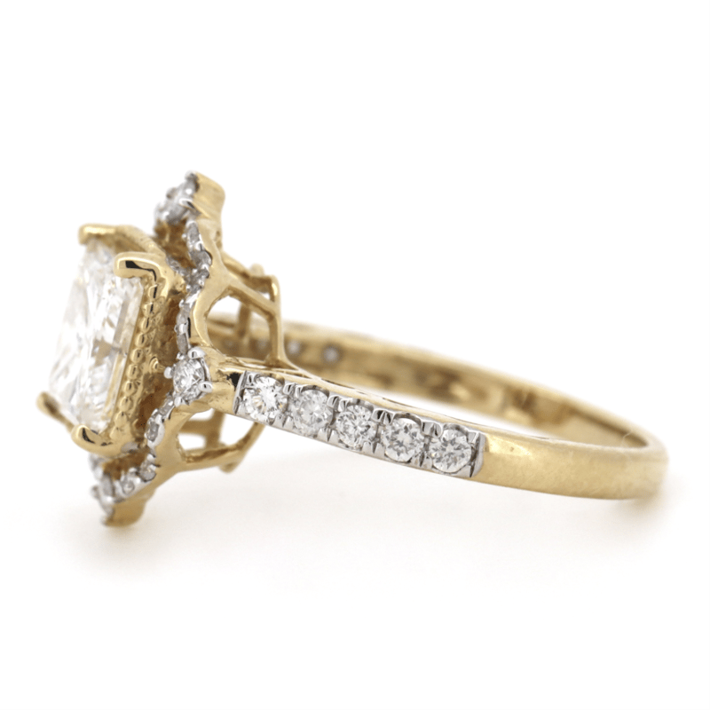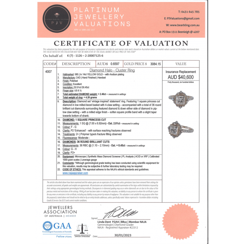 The Centre Features, One Square Princess Cut, Diamond (2.01Ct, F-G Colour, P2 Clarity, Enhanced), 4 Claw Set. Surrounding The Centre In A Decorative Halo And Decorating The Band Are, 36 Round Brilliant Cut, Diamonds (0.45Ct Tdw, G-H Colour, P2+ Clarity), Pip-Low/Claw Set With Millegrain Edging. The Centre Setting Has Been Detailed With Millegrain Edging. Ring Size M 1/2.