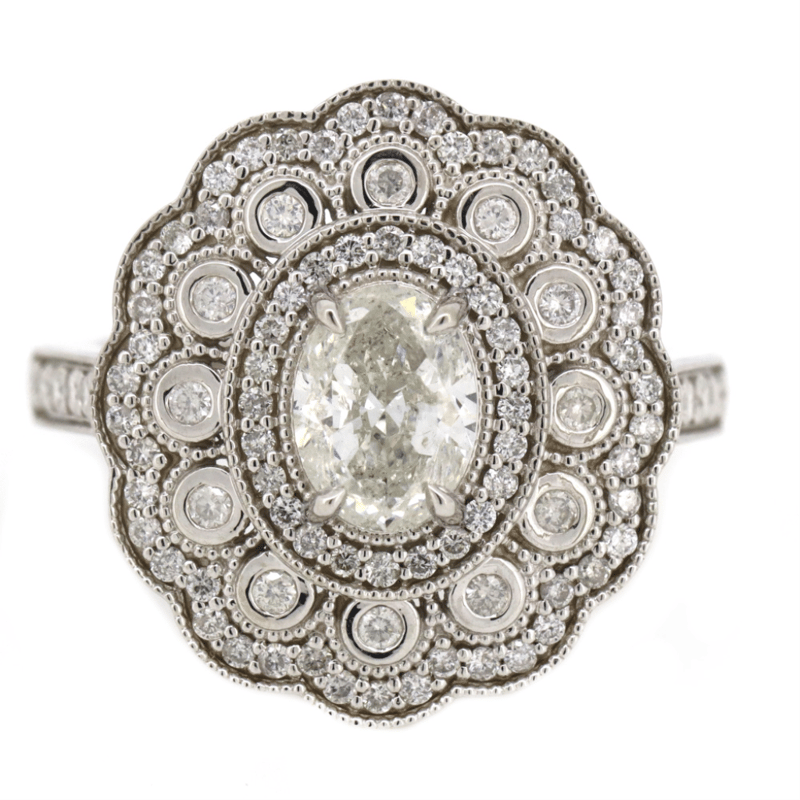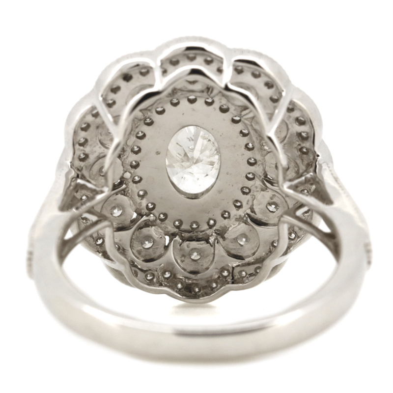 The Centre Features, One Oval Cut, Diamond (1.01Ct Tdw, G Colour, P2 Clarity), Bezel Set. Surrounding The Design Are, 92 Round Brilliant Cut, Diamonds (0.64Ct Tdw, H-K Colour, Si1-Si2 Clarity), Micro-Bead Set. Ring Size O.