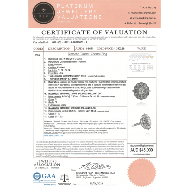 This Insurance Valuation has been provided by a registered Jewellery Valuer and is intended for insurance purposes only. The valuation amount has no bearing on the auction value of the item. Any questions regarding the valuation should be directed to the issuing Valuer (refer to contact details on the certificate) as Lloyds have no association or relationship with the Valuer or the valuation amount contained within the valuation.