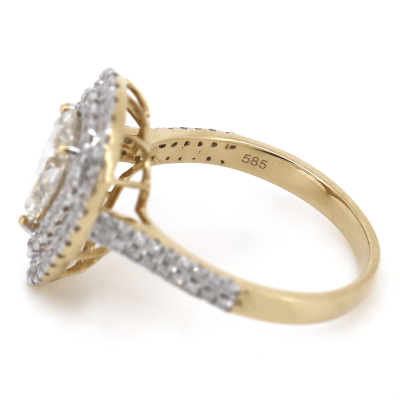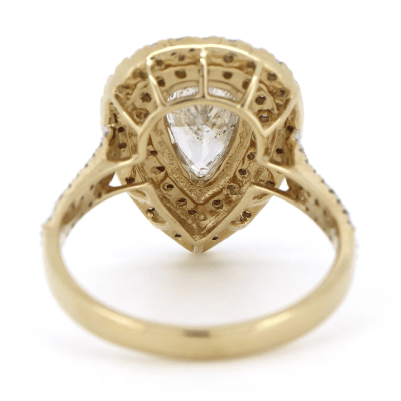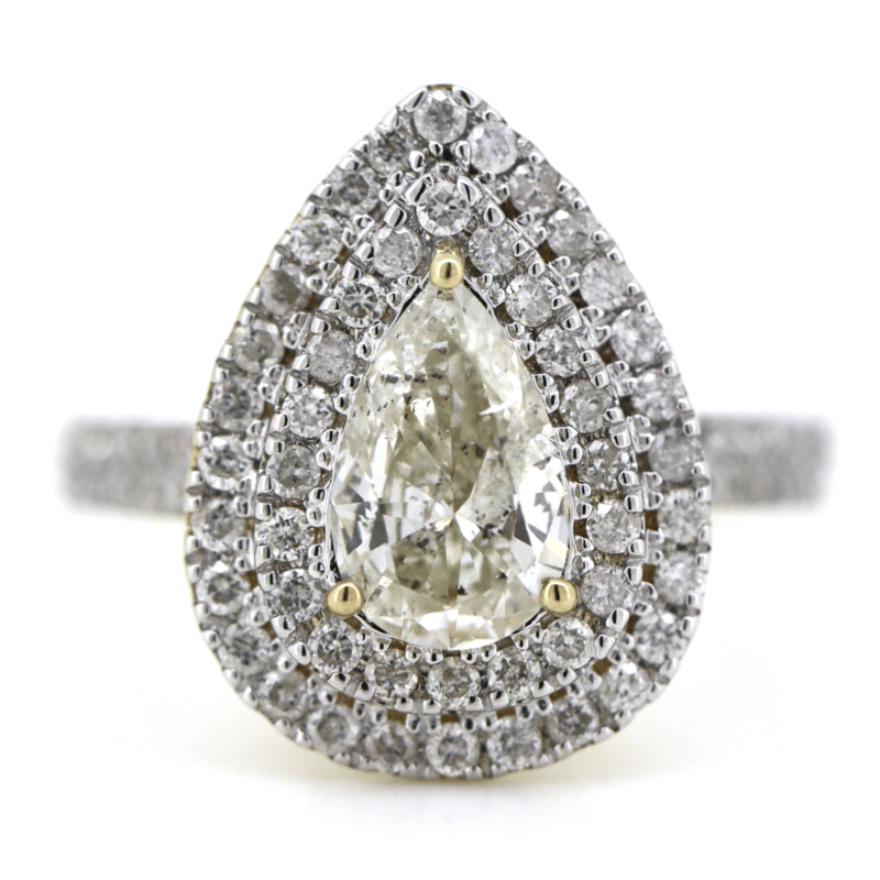 The Centre Features, One Pear Cut, Fancy Light Yellow, Diamond (1.01Ct, Si2 Clarity), 3 Claw Set. Surrounding The Centre In A Double Halo And Decorating The Band Are, 84 Round Brilliant Cut, Diamonds (0.66Ct Tdw, G-I Colour, Si2+ Clarity), Claw Set. Ring Size M.