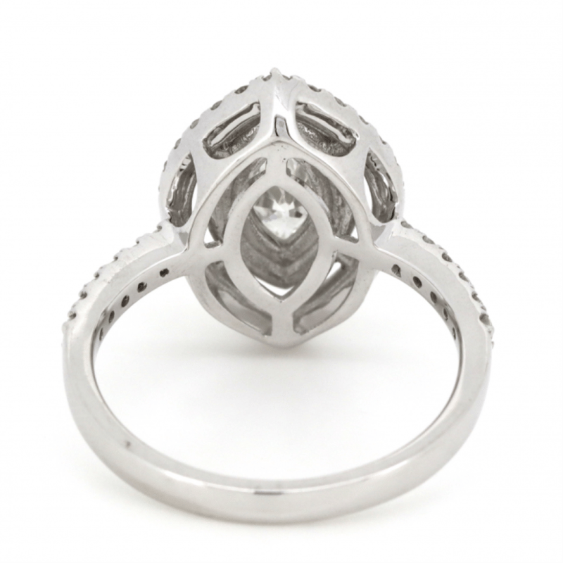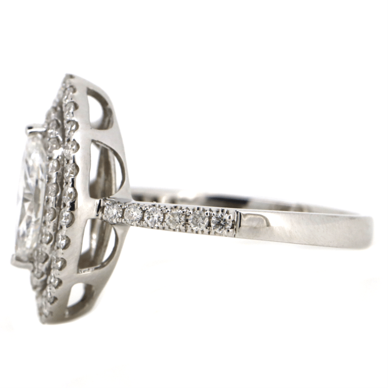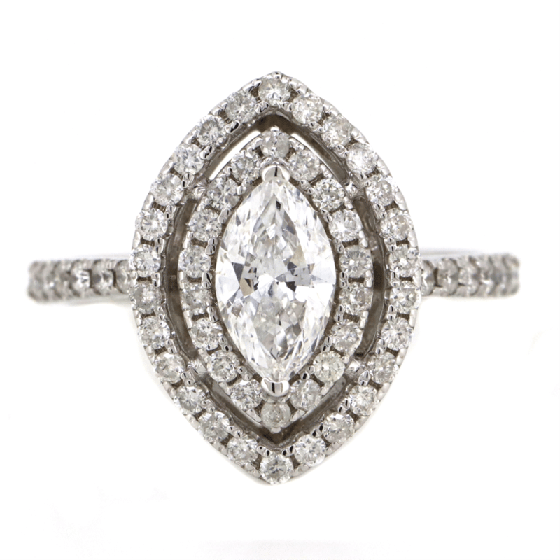 The Centre Features, One Marquise Cut, Diamond (0.69Ct, H-I Colour, P1+ Clarity), Claw Set. Surrounding The Centre In A Double Halo And Decorating The Band Are, 56 Round Brilliant Cut, Diamonds (0.555Ct Tdw, H-K Colour, P1+ Clarity), Claw Set.