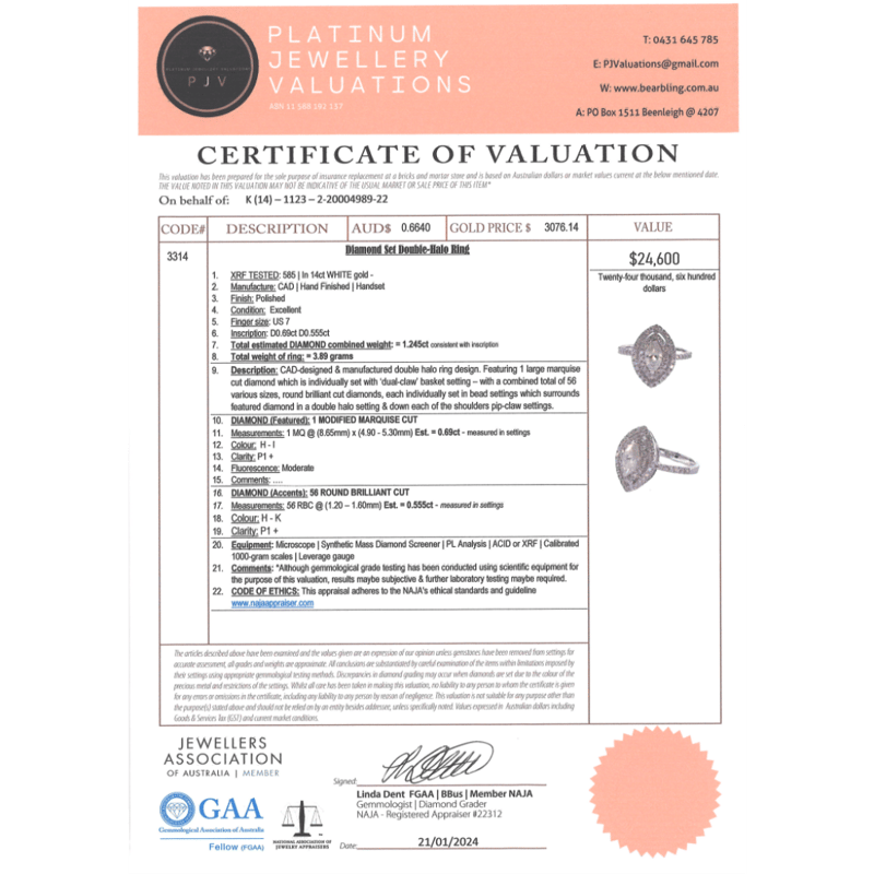 This Insurance Valuation has been provided by a registered Jewellery Valuer and is intended for insurance purposes only. The valuation amount has no bearing on the auction value of the item. Any questions regarding the valuation should be directed to the issuing Valuer (refer to contact details on the certificate) as Lloyds have no association or relationship with the Valuer or the valuation amount contained within the valuation.