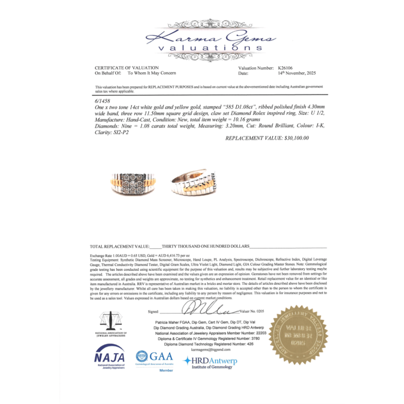 14K WHITE/YELLOW GOLD AND 1.08CT TDW DIAMOND, GENTS RING.
