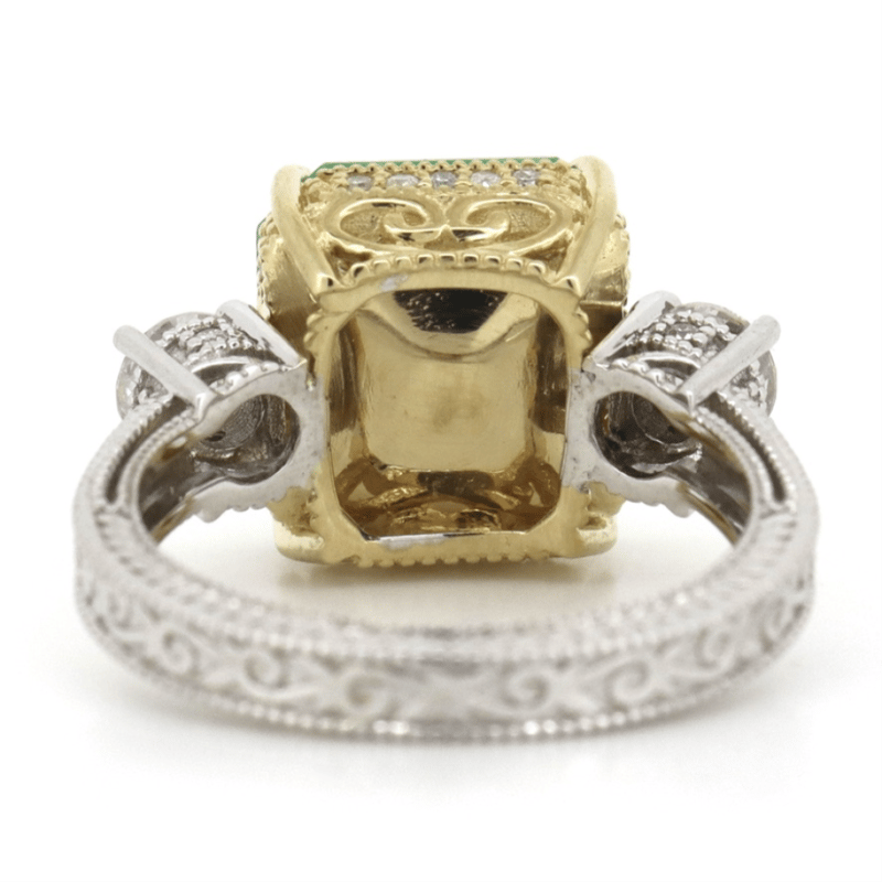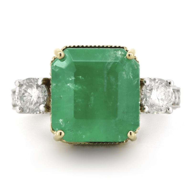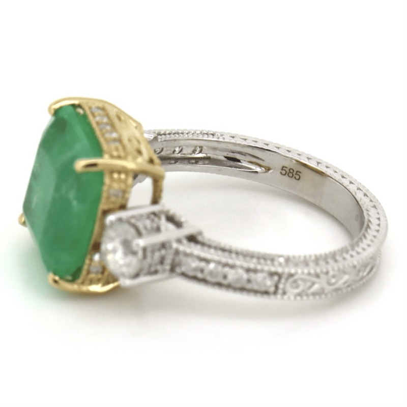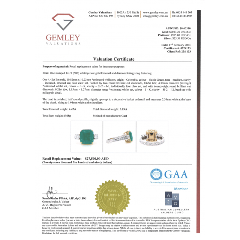 14K WHITE/YELLOW GOLD, 4.42CT COLOMBIAN EMERALD AND DIAMOND, TRILOGY RING. The Centre Features, One Emerald Cut, Medium Bluish-Green, Colombian Emerald (4.42Ct, Included), Claw Set. Flanking The Centre Are, 2 Round Brilliant Cut, Diamonds (0.62Ct Tdw, J-K Colour, Si2-I1 Clarity), Claw Set. Embellishing The Band Are, 28 Round Brilliant Cut, Diamonds (0.83Ct Tdw, J-K Colour, Si2-I2 Clarity), Bead Set. Ring Size L 1/2. Jewellery Valuations Provided By A Third Party Professional Not Directly Associated With Lloyds Auctions at AUD $27,590.00This Insurance Valuation has been provided by a registered Jewellery Valuer and is intended for insurance purposes only. The valuation amount has no bearing on the auction value of the item. Any questions regarding the valuation should be directed to the issuing Valuer (refer to contact details on the certificate) as Lloyds have no association or relationship with the Valuer or the valuation amount contained within the valuation. CONDITION: GOOD 0645892+5179