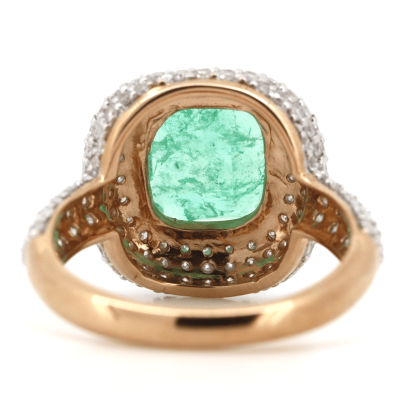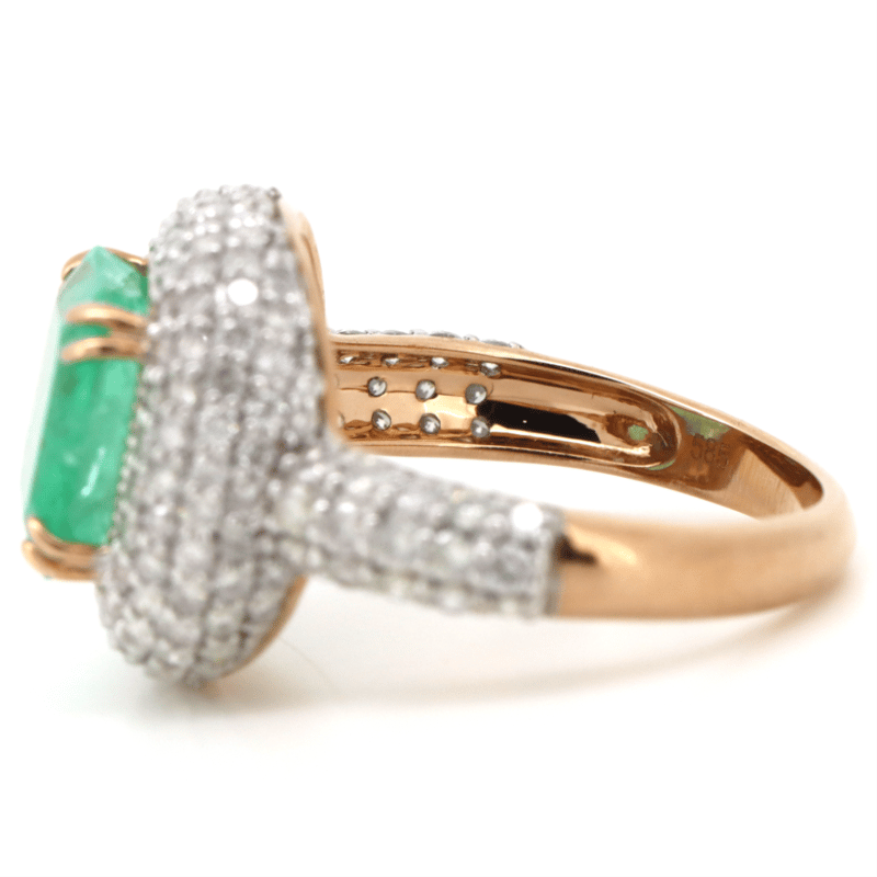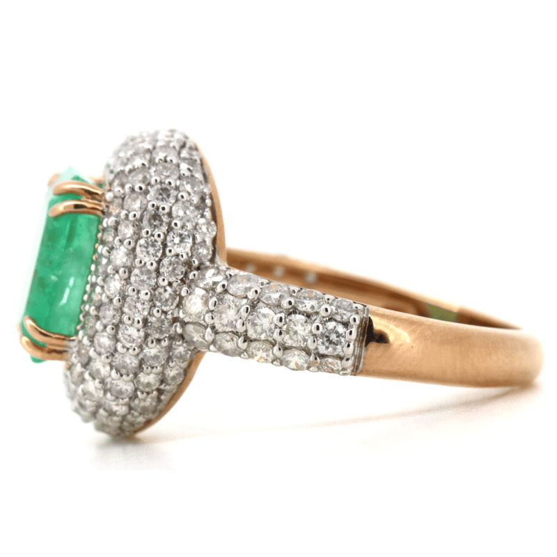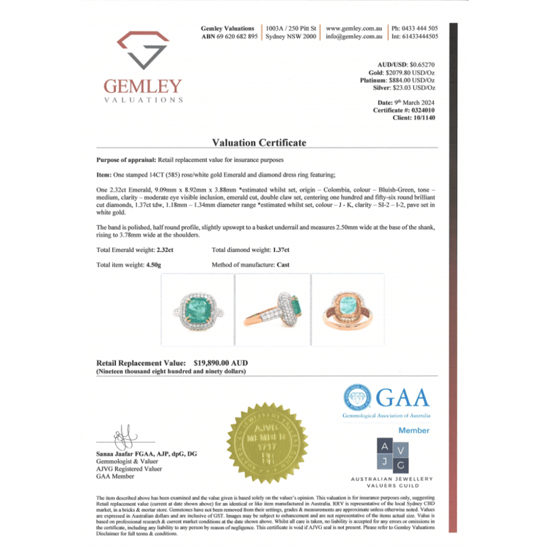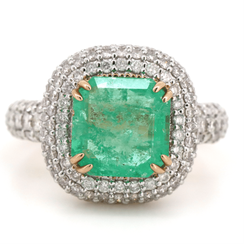14K ROSE/WHITE GOLD, 2.32CT COLOMBIAN EMERALD AND DIAMOND, CLUSTER HALO RING. The Centre Features, One Emerald Cut, Medium Bluish Green, Colombian Emerald (2.32Ct, Moderate Eye Visible Inclusions), Double Claw Set. Decorating The Setting Are, 156 Round Brilliant Cut, Diamonds (1.37Ct Tdw, J-K Colour, Si2-I2 Clarity), Pave Set In White Gold. Ring Size N. Jewellery Valuations Provided By A Third Party Professional Not Directly Associated With Lloyds Auctions at AUD $19,890.00This Insurance Valuation has been provided by a registered Jewellery Valuer and is intended for insurance purposes only. The valuation amount has no bearing on the auction value of the item. Any questions regarding the valuation should be directed to the issuing Valuer (refer to contact details on the certificate) as Lloyds have no association or relationship with the Valuer or the valuation amount contained within the valuation. CONDITION: GOOD 0645892+5165