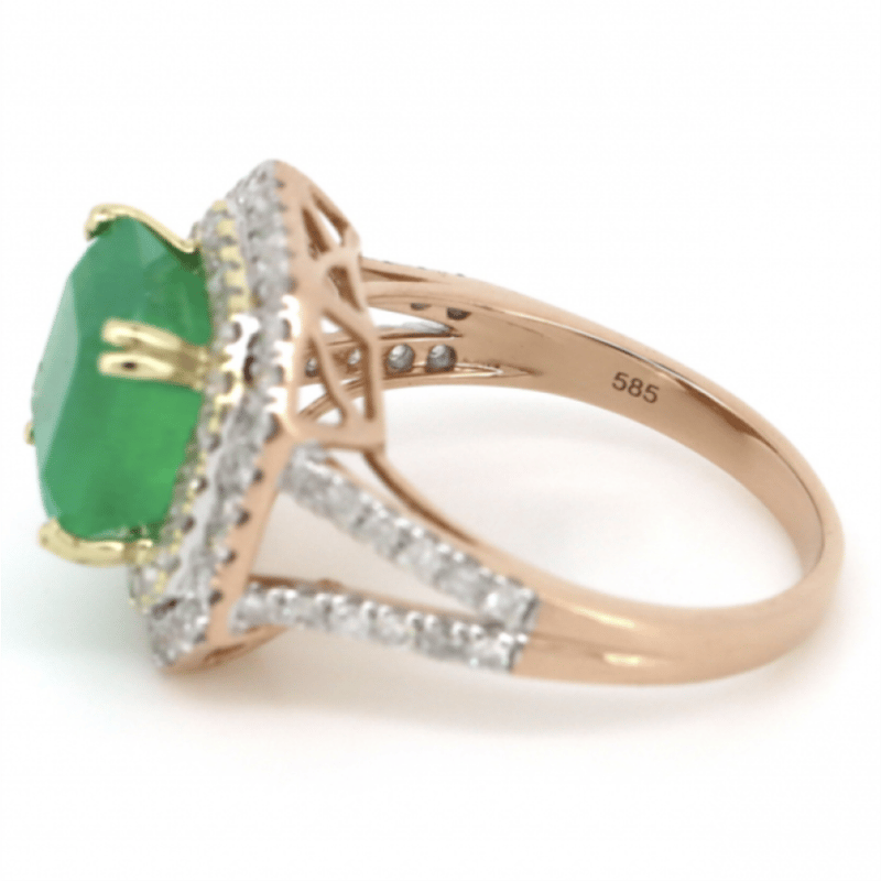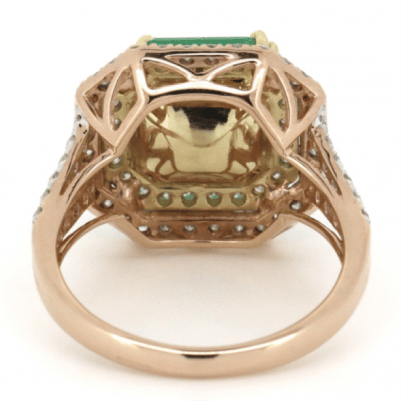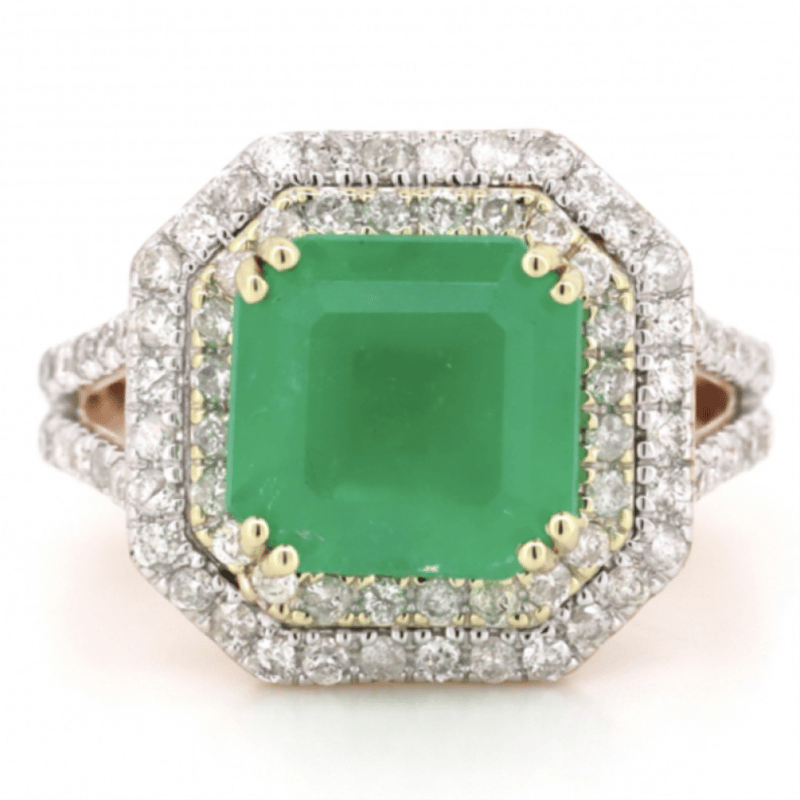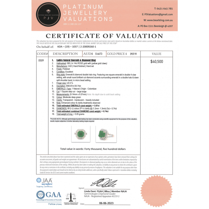 14K ROSE GOLD, 3.87CT COLOMBIAN EMERALD AND DIAMOND, DOUBLE HALO SPLIT BAND RING. The Centre Features, One Square Step Cut, Moderate Deep Green, Colombian Emerald (3.87Ct, Heavily Included, Enhanced), Double 4 Claw Set. Surrounding The Centre In A Double Halo And Decorating The Split Band Are, 80 Round Brilliant Cut, Diamonds (0.74Ct Tdw, I-J Colour, P1+ Clarity), Micro-Bead Set. Ring Size M 1/2. Jewellery Valuations Provided By A Third Party Professional Not Directly Associated With Lloyds Auctions at AUD $40,500.00This Insurance Valuation has been provided by a registered Jewellery Valuer and is intended for insurance purposes only. The valuation amount has no bearing on the auction value of the item. Any questions regarding the valuation should be directed to the issuing Valuer (refer to contact details on the certificate) as Lloyds have no association or relationship with the Valuer or the valuation amount contained within the valuation. CONDITION: GOOD 0645892+5116