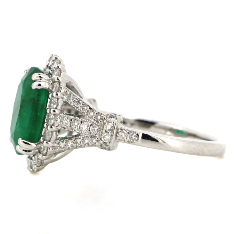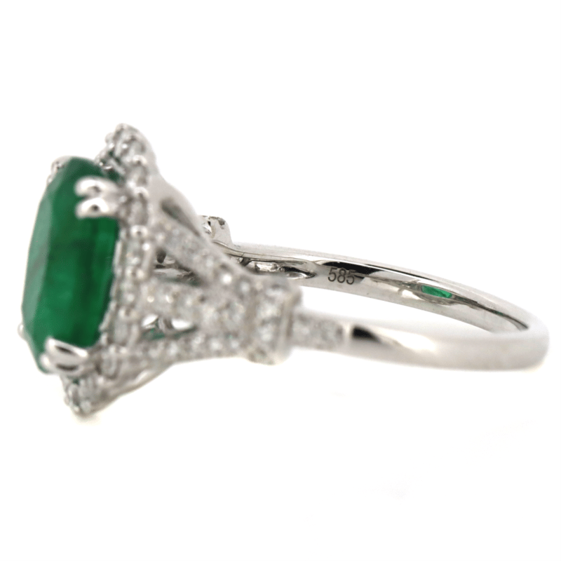 14K WHITE GOLD, EMERALD AND DIAMOND, HALO RING.