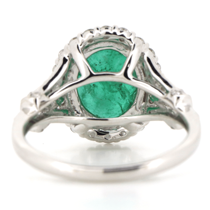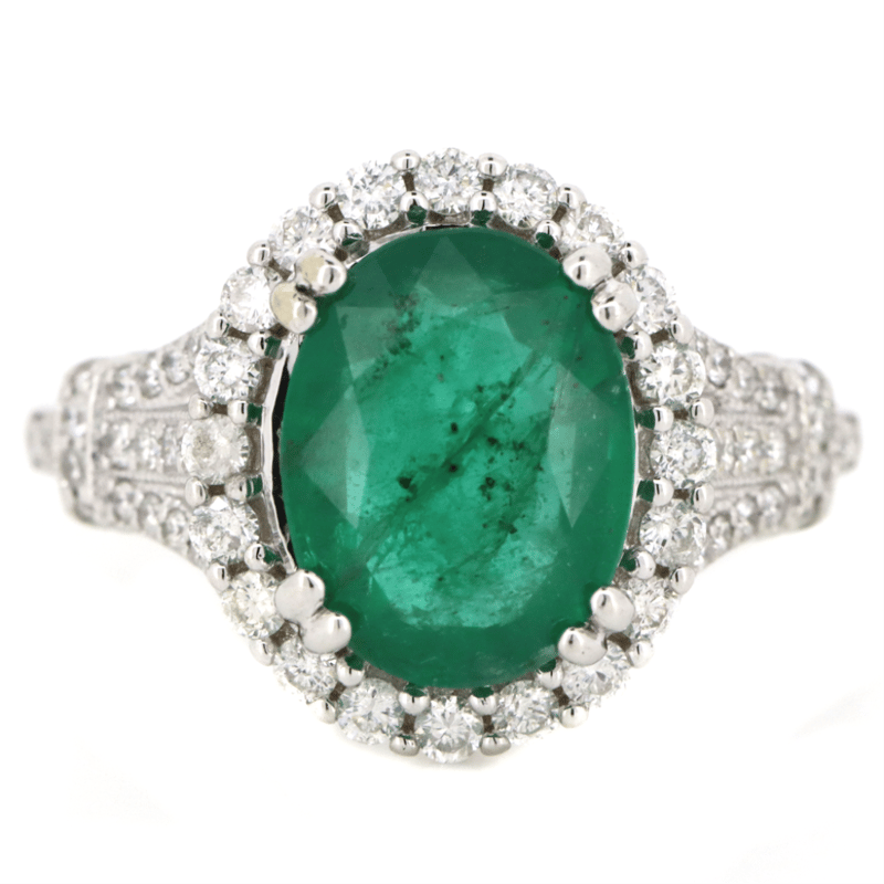 The Centre Features, One Oval Cut, Emerald (3.34Ct, Moderate Inclusions), Double Claw Set. Surrounding The Centre In A Halo And Decorating The Shoulders Are, 64 Round Brilliant Cut, Diamonds (0.74Ct Tdw, G-H Colour, Si1-Si2 Clarity), Bead Set. Ring Size P 1/2.
