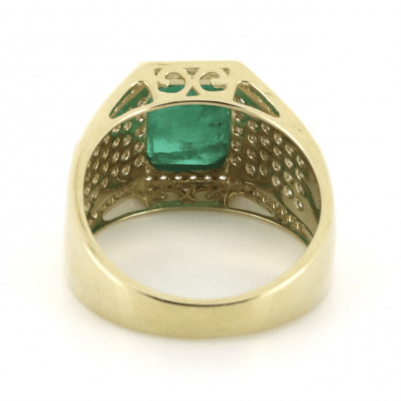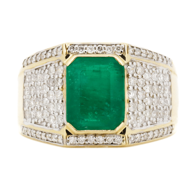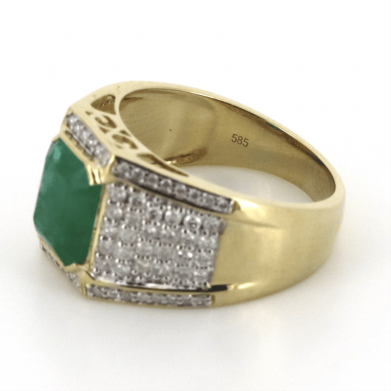 14K YELLOW GOLD, EMERALD AND DIAMOND, GENTS RING.