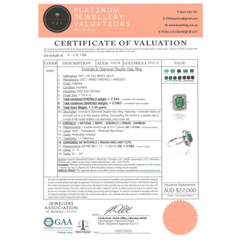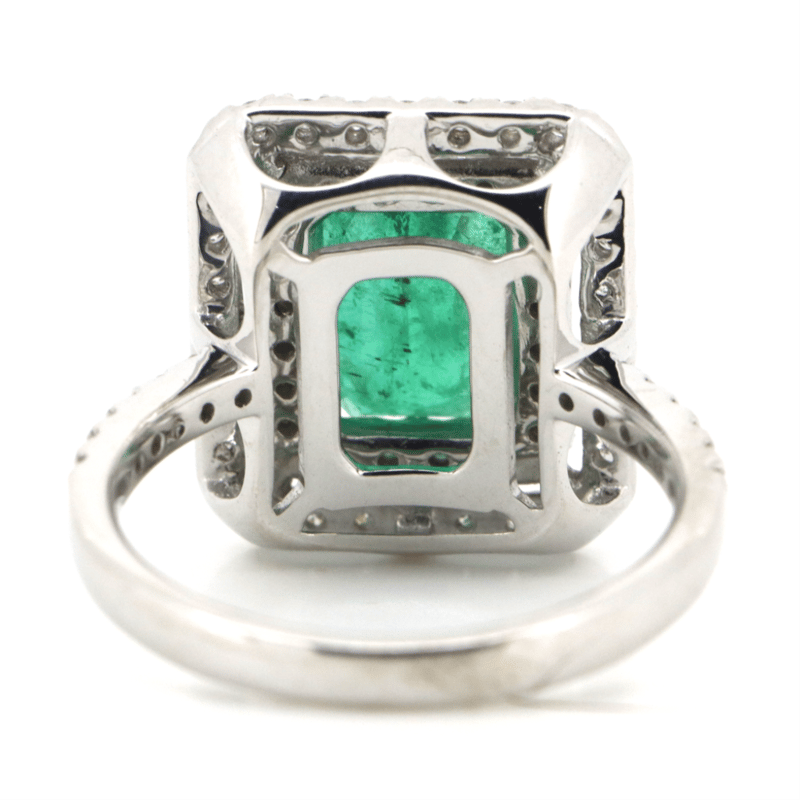 The Centre Features, One Moderate Blue Green, Emerald Cut, Emerald (2.33Ct, Moderate Inclusions), Claw Set. Surrounding The Centre In A Double Halo Are, 68 Round Brilliant Cut, Diamonds (0.58Ct Tdw, G-H Colour, Si1-Si2 Clarity), Micro-Claw Set. Ring Size M 1/2.