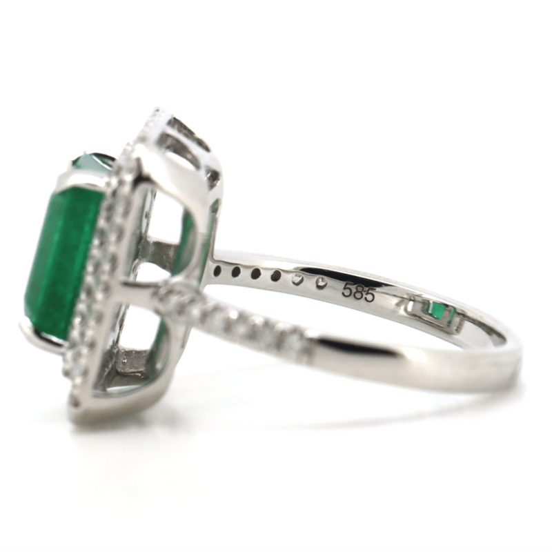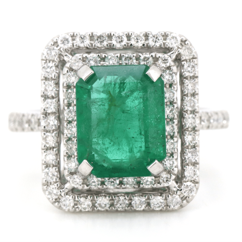 14K WHITE GOLD, EMERALD AND DIAMOND, DOUBLE HALO RING.