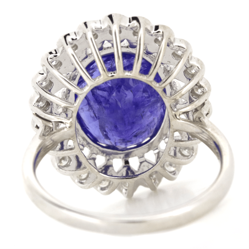 The Centre Feature, One Oval Faceted Cut, Deep Violetish-Blue, Tanzanite (7.30Ct, Moderate-Heavy Naturally Included), Multi-Claw Set. Surrounding The Centre In A Halo Are, 22 Round Brilliant Cut, Diamonds (0.44Ct Tdw, H-K Colour, Si-I2 Clarity, 1.75Mm), Bead/Bezel Set. Ring Size P.