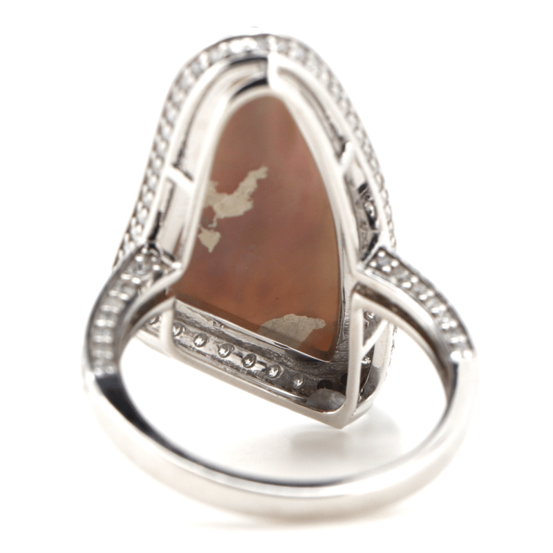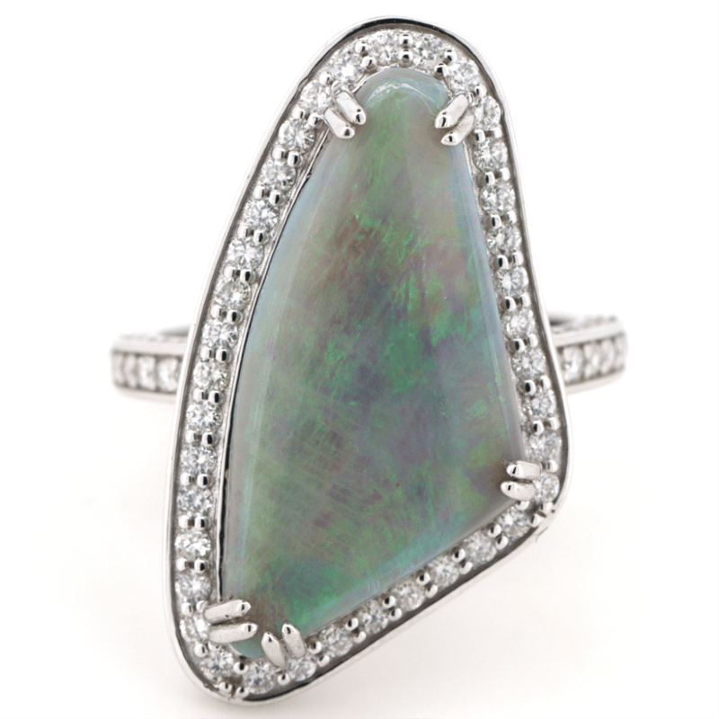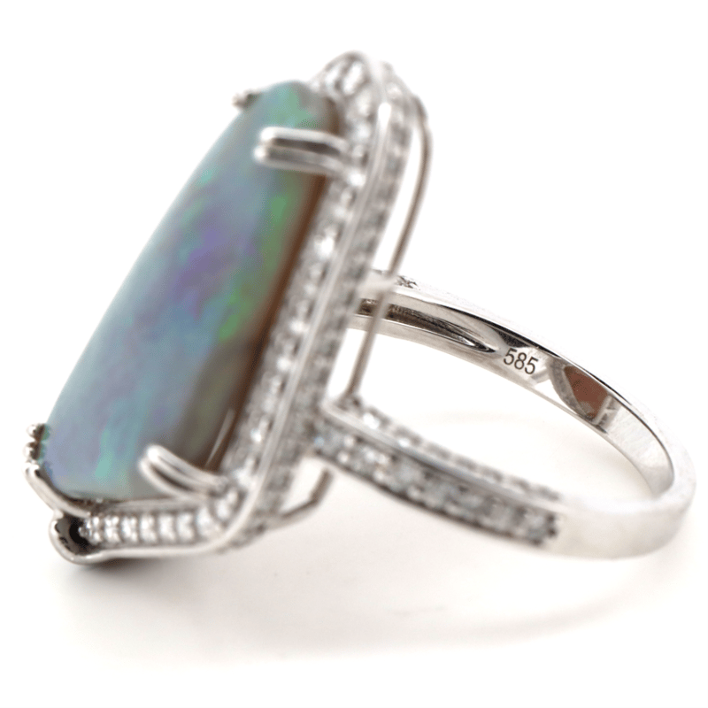 14K YELLOW GOLD, 5.67CT LIGHTENING RIDGE OPAL AND DIAMOND, HALO RING. The Centre Features, One Free-Form Cabochon Cut, Lightening Ridge Opal (5.67Ct, Green, Blue, Yellow, Purple Colour Play), Double Claw Set. Decorating The Setting And Band Are, 134 Round Brilliant Cut, Diamonds (1.00Ct Tdw, G-I Colour, Si-I1 Clarity), Bead Set. Ring Size O. Jewellery Valuations Provided By A Third Party Professional Not Directly Associated With Lloyds Auctions at AUD $35,000.00This Insurance Valuation has been provided by a registered Jewellery Valuer and is intended for insurance purposes only. The valuation amount has no bearing on the auction value of the item. Any questions regarding the valuation should be directed to the issuing Valuer (refer to contact details on the certificate) as Lloyds have no association or relationship with the Valuer or the valuation amount contained within the valuation. CONDITION: GOOD 0645892+5112