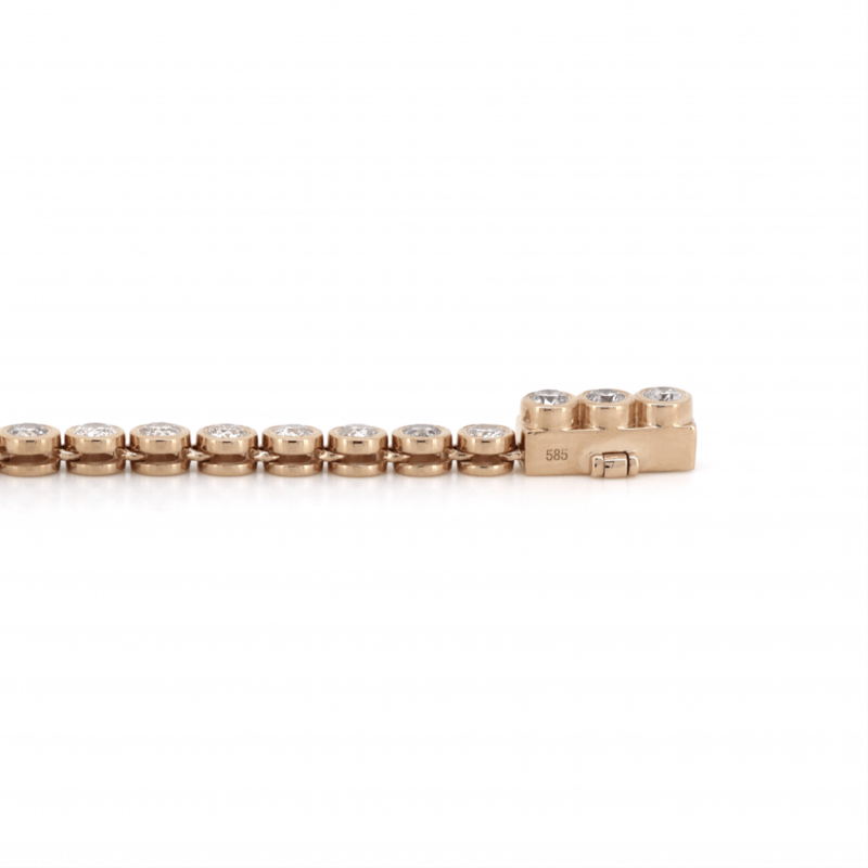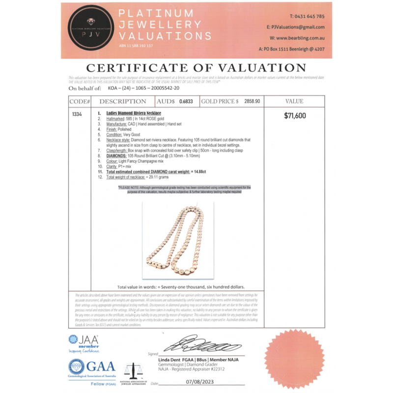 14K ROSE GOLD, 14.88CT TDW CHAMPAGNE DIAMOND, RIVIERA NECKLACE. The Design Features, 105 Round Brilliant Cut, Light Fancy Champagne, Diamonds (14.88Ct Tdw, P1+ Clarity), Bezel Set. The Necklace Has A Box Lock Clasp, With One Safety Latch. Necklace Length Is 50.5Cm. Jewellery Valuations Provided By A Third Party Professional Not Directly Associated With Lloyds Auctions at AUD $71,600.00This Insurance Valuation has been provided by a registered Jewellery Valuer and is intended for insurance purposes only. The valuation amount has no bearing on the auction value of the item. Any questions regarding the valuation should be directed to the issuing Valuer (refer to contact details on the certificate) as Lloyds have no association or relationship with the Valuer or the valuation amount contained within the valuation. CONDITION: GOOD 0645892+5162