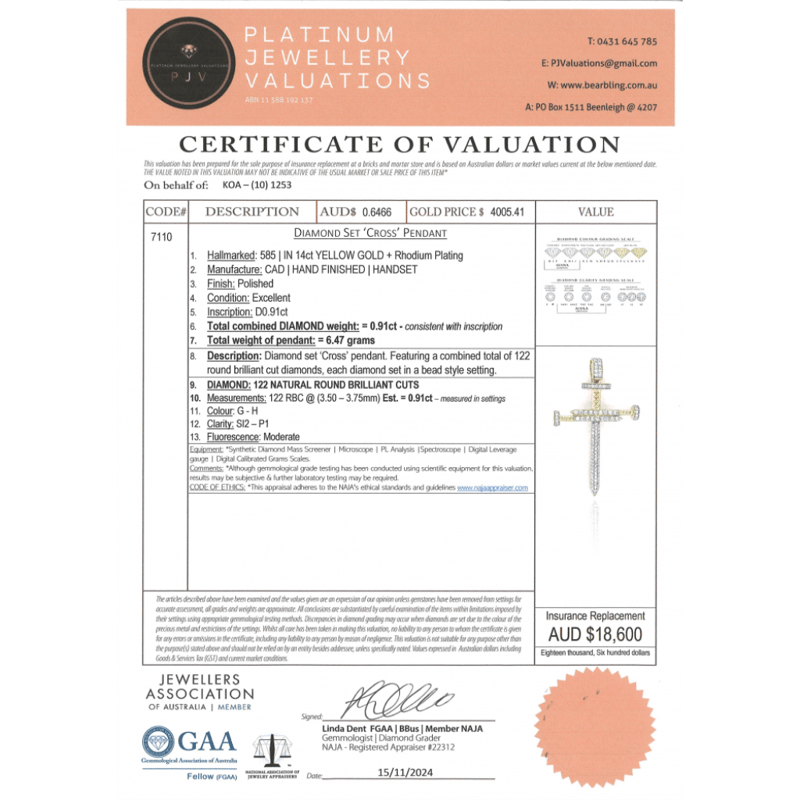 This Insurance Valuation has been provided by a registered Jewellery Valuer and is intended for insurance purposes only. The valuation amount has no bearing on the auction value of the item. Any questions regarding the valuation should be directed to the issuing Valuer (refer to contact details on the certificate) as Lloyds have no association or relationship with the Valuer or the valuation amount contained within the valuation.