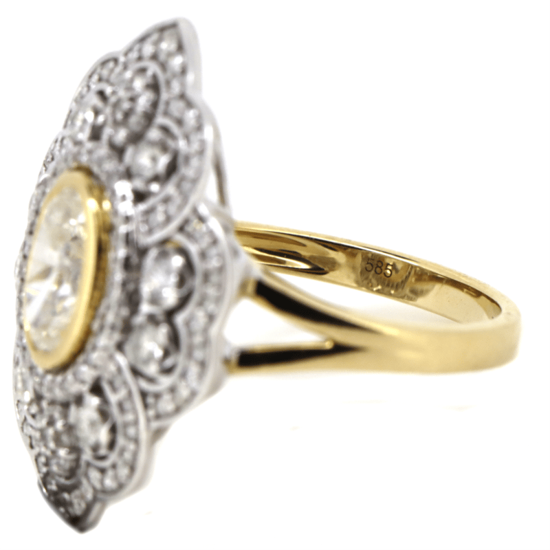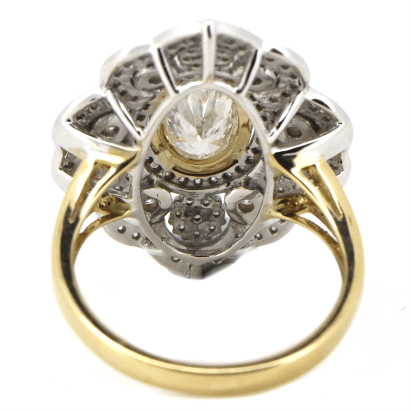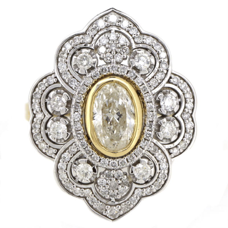 The Centre Design Features, One Oval Modified Cut, Diamond (1.01Ct, H-I Colour, P2 Clarity), Bezel Set. Encompassing The Design Are, 108 Round Brilliant Cut, Diamonds (0.81Ct Tdw, G-I Colour, Si2-P2Clarity), Bead/Claw Set. Ring Size O 1/2.