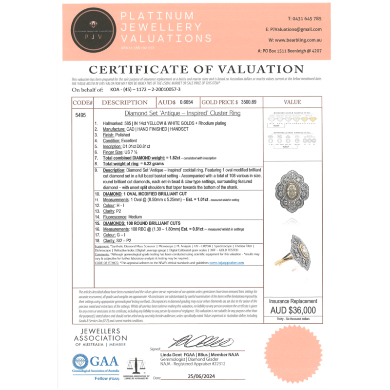This Insurance Valuation has been provided by a registered Jewellery Valuer and is intended for insurance purposes only. The valuation amount has no bearing on the auction value of the item. Any questions regarding the valuation should be directed to the issuing Valuer (refer to contact details on the certificate) as Lloyds have no association or relationship with the Valuer or the valuation amount contained within the valuation.
