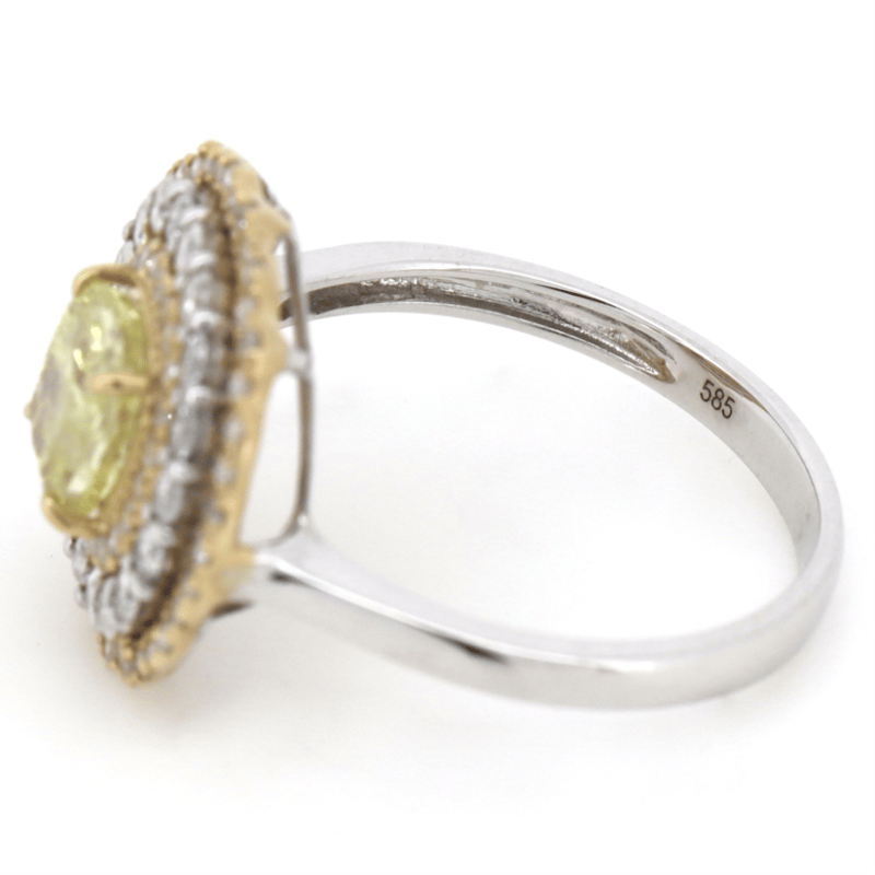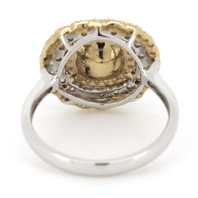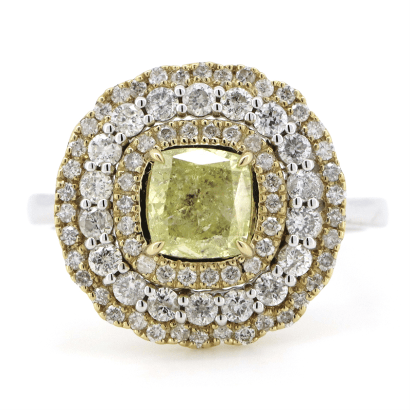 The Centre Features One Cushion Cut, Fancy Yellow, Diamond (1.02Ct, P2+ Clarity, Enhanced), 4 Claw Set. Surrounding The Centre In A Triple Halo Are, 78 Round Brilliant Cut, Diamonds (0.68Ct Tdw, G-H Colour, P2+ Clarity), Bead Set In White/Yellow Gold. Ring Size N 1/2.