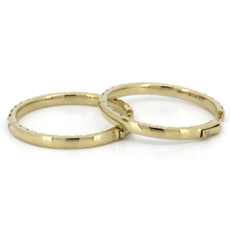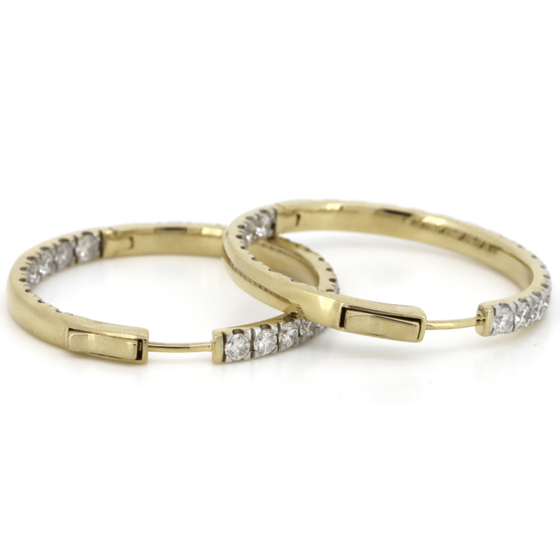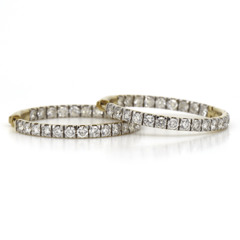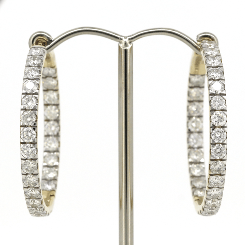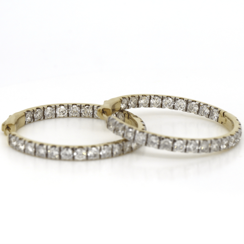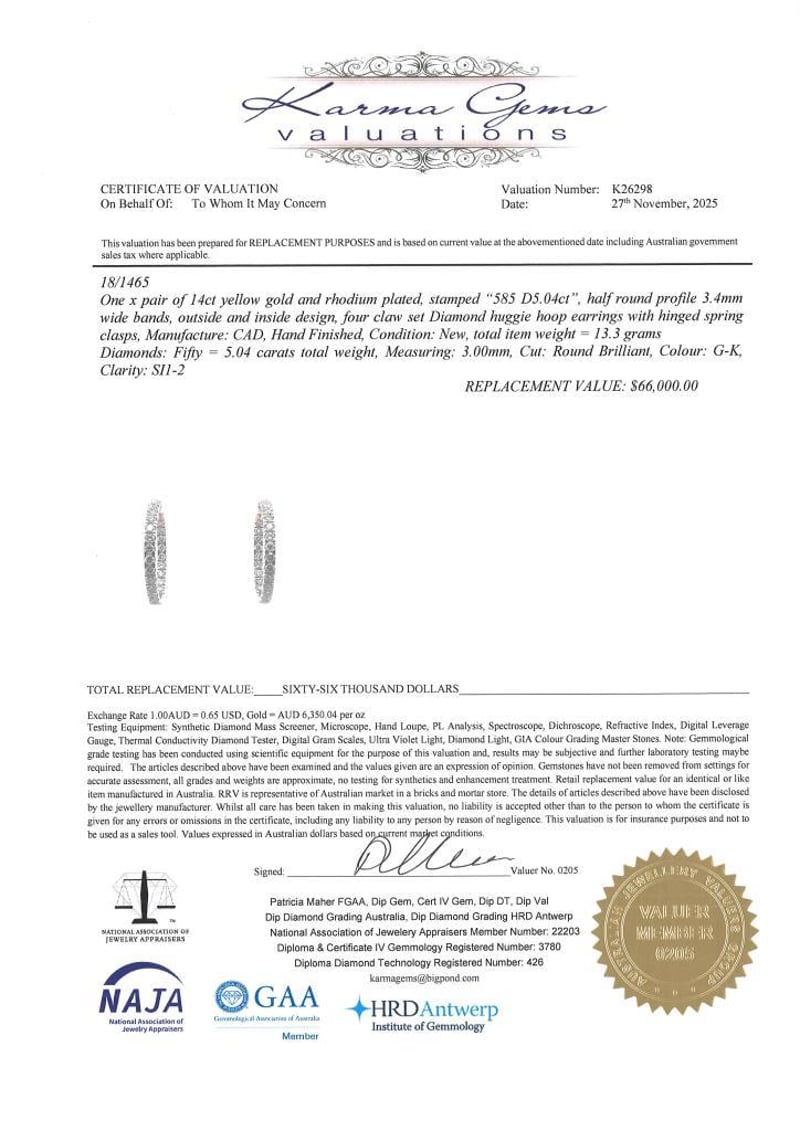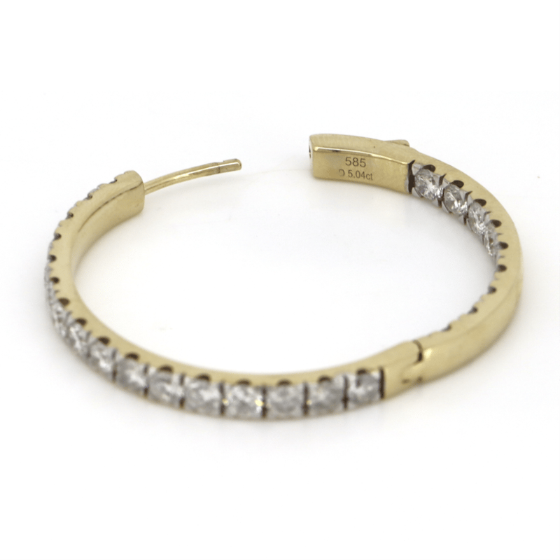 14K YELLOW GOLD, 5.04CT TDW DIAMOND, HOOP EARRINGS. The Hoops Feature, 50 Round Brilliant Cut, Diamonds (5.04Ct Tdw, G-K Colour, Si1-2 Clarity), 4 Claw Set. The Earrings Have Hinged Closures. Jewellery Valuations Provided By A Third Party Professional Not Directly Associated With Lloyds Auctions at AUD $66000This Insurance Valuation has been provided by a registered Jewellery Valuer and is intended for insurance purposes only. The valuation amount has no bearing on the auction value of the item. Any questions regarding the valuation should be directed to the issuing Valuer (refer to contact details on the certificate) as Lloyds have no association or relationship with the Valuer or the valuation amount contained within the valuation. CONDITION: GOOD 0645892+5153