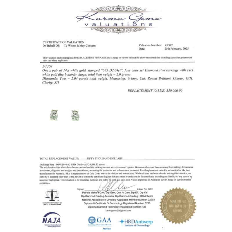 The Centres Feature, 2 Round Brilliant Cut, Diamonds (2.04Ct Tdw, G-H Colour, Si1 Clarity), Claw Set. Earrings Have Post Backs And Come With 14K White Gold Backs.