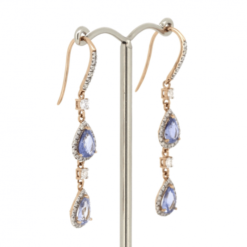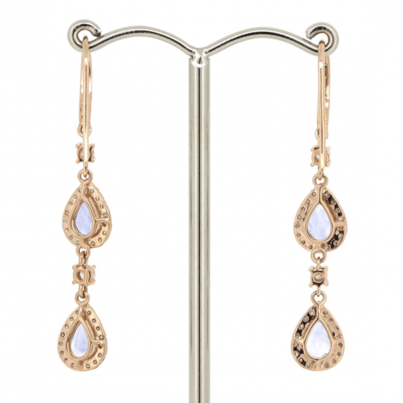 14K ROSE GOLD, 3.60CT TSW BLUE CEYLON SAPPHIRE AND DIAMOND, DOUBLE DROP EARRINGS.