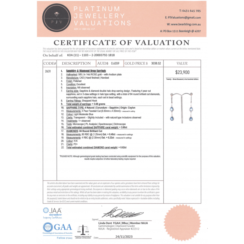 The Drops Feature, 4 Pear Faceted Cut, Light Moderate Blue, Ceylon Sapphires (3.60Ct Tsw, Slightly Included, Enhanced), 3 Claw Set. Surrounding The Centres In Individual Halos And Decorating The Joins/Hooks Are, 84 Round Brilliant Cut, Diamonds (0.62Ct Tdw, H-K Colour, P2+ Clarity), Bead Set. The Earrings Have Shepherd Hooks.