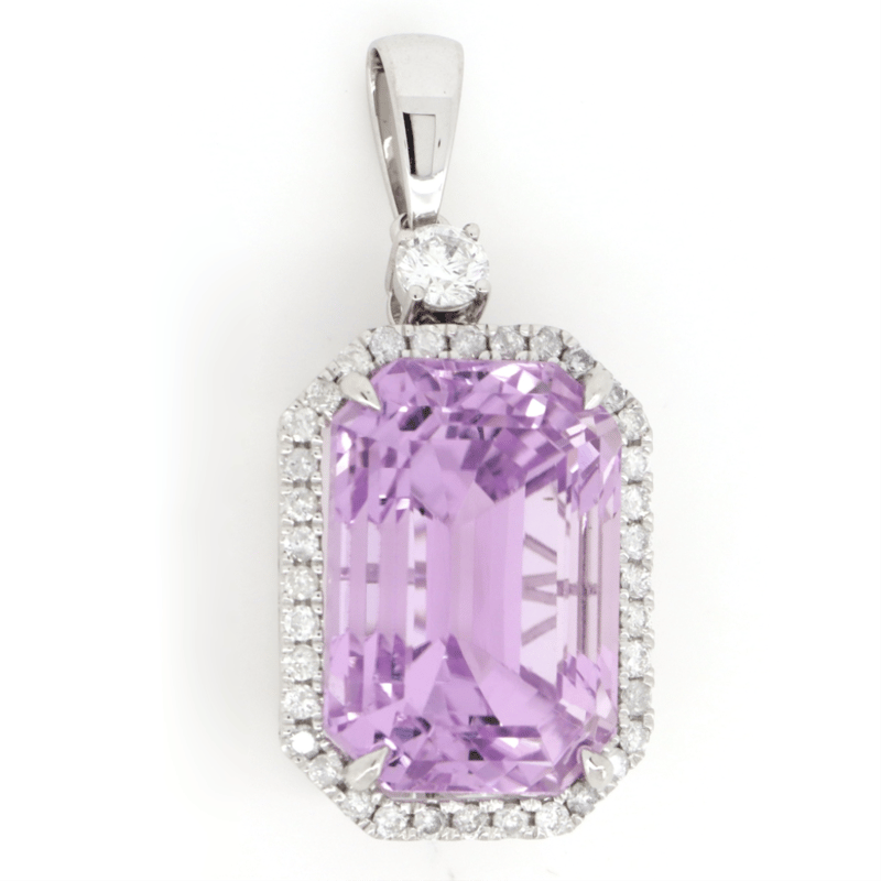 The Centre Features, One Emerald Cut, Medium Purplish-Pink, Kunzite (37.73Ct, Minor Eye Visible Inclusions), Claw Set. Surrounding The Centre In A Halo And On The Bail Are, 37 Round Brilliant Cut, Diamonds (1.00Ct Tdw, G-J Colour, Si1-I1 Clarity), Claw Set.