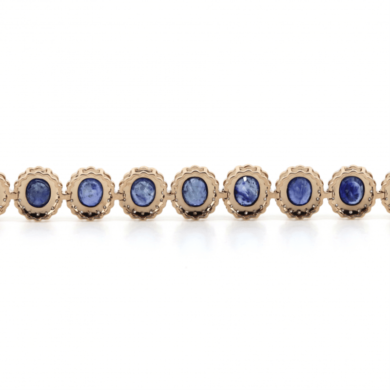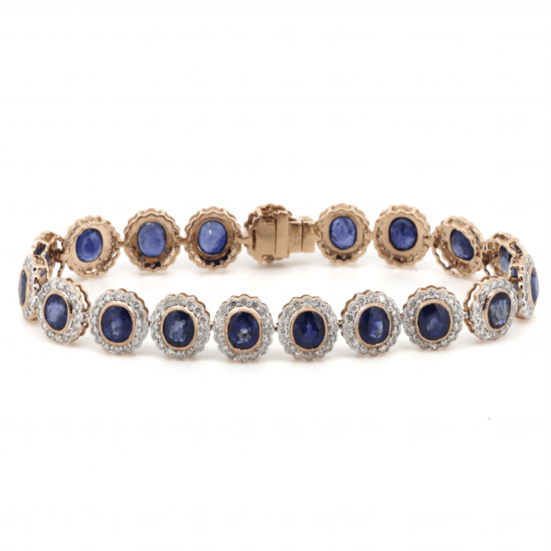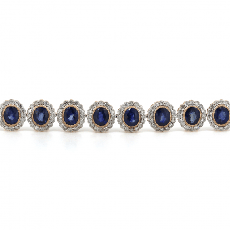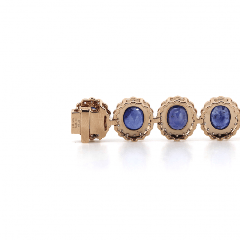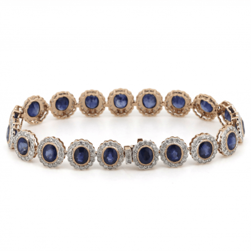 The Design Features, 19 Oval Cut, Blue, Sapphires (16.84Ct Tsw, Moderate Eye Visible Inclusions), Bezel Set With Millegrain Detail. Surrounding The Centres In Halos Are, 307 Round Brilliant Cut, Diamonds (3.22Ct Tdw, J-K Colour, Si2-I2 Clarity), Semi-Bezel/Bead Set In White Gold. The Bracelet Has A Box Lock Closure With A Hinged Safety Catch. Bracelet Length Is 18.2Cm.
