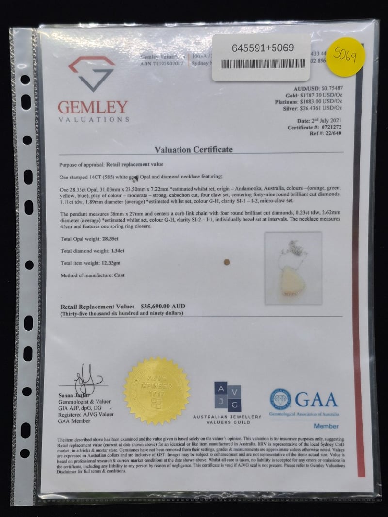 Featuring 28.35Ct Amdamooka Australia Opal, Curb Link Chain With 4 Round Brilliant Diamonds 1.34Tct. Complete With Certficate Of Authenticity