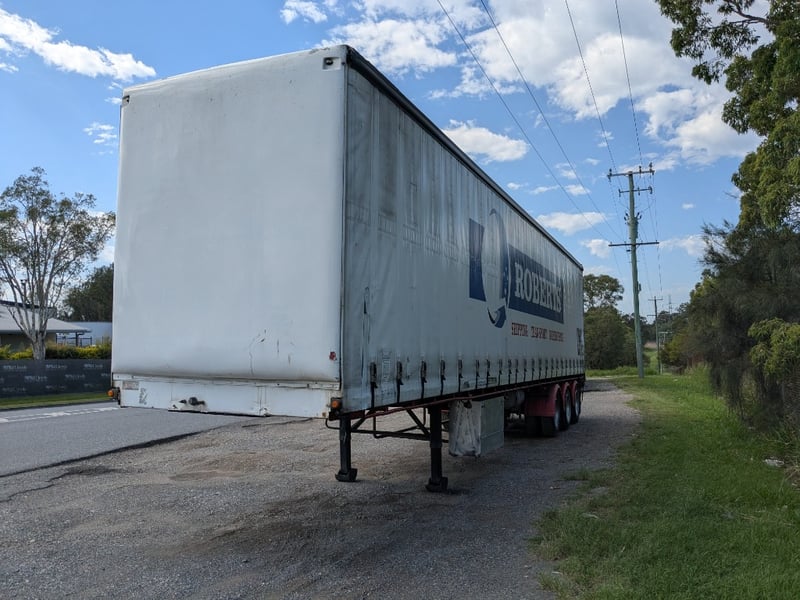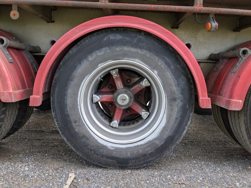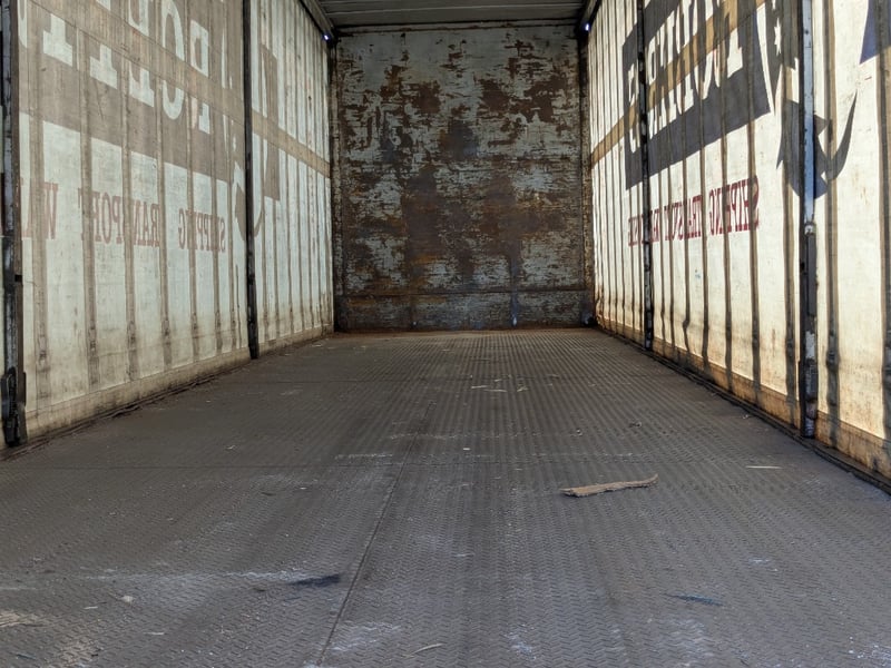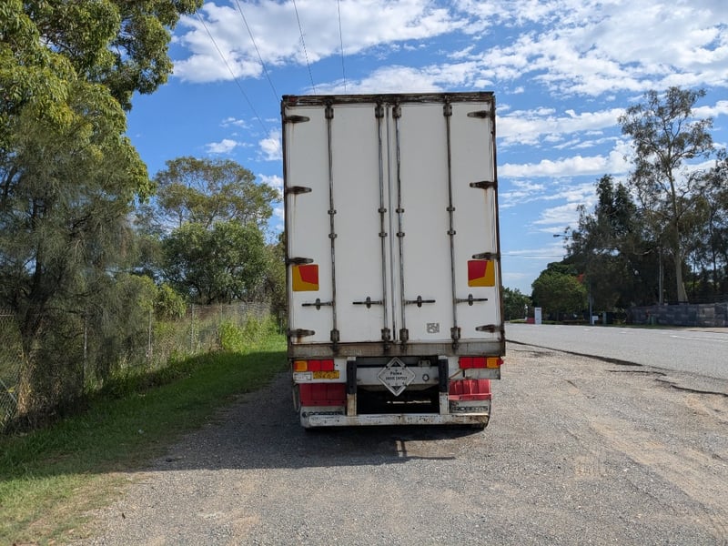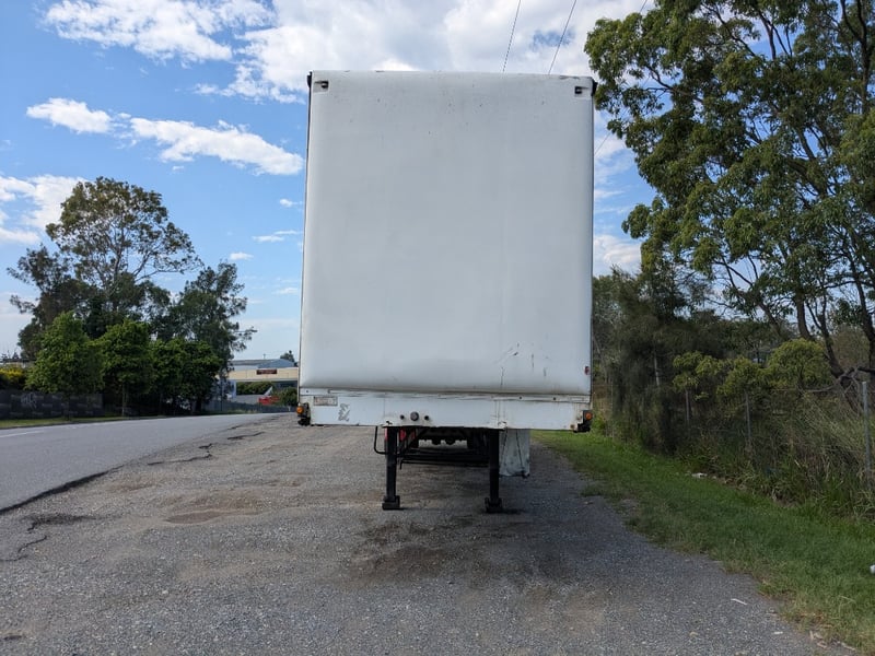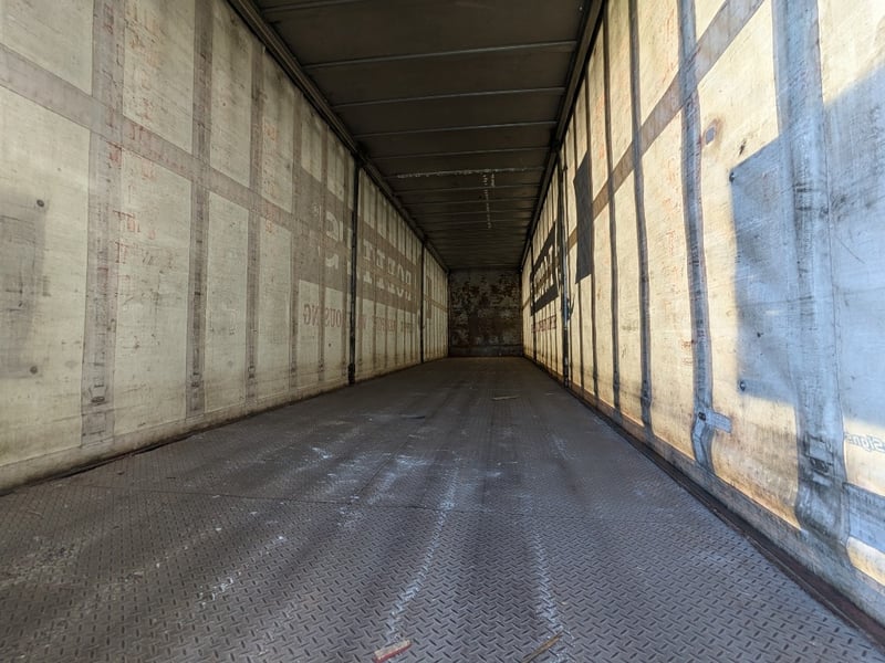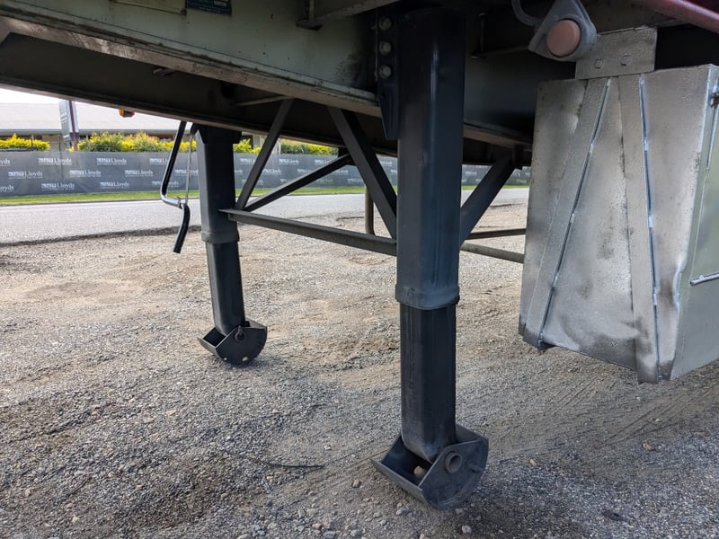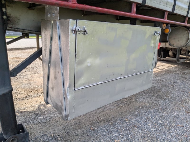 Description/Extras: The trailer sits on three rear axles (tri-axle setup), Landing legs are supporting the front of the trailer, Steel flooring, under trailer took box, wash tank,