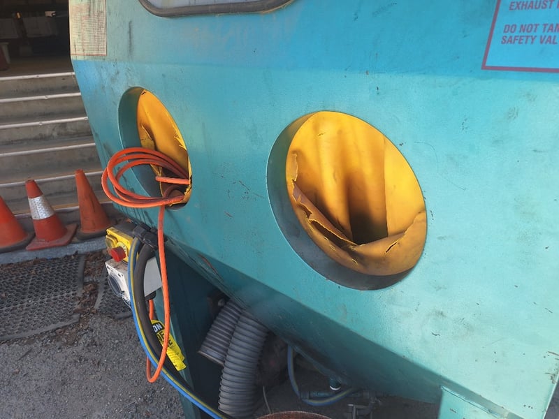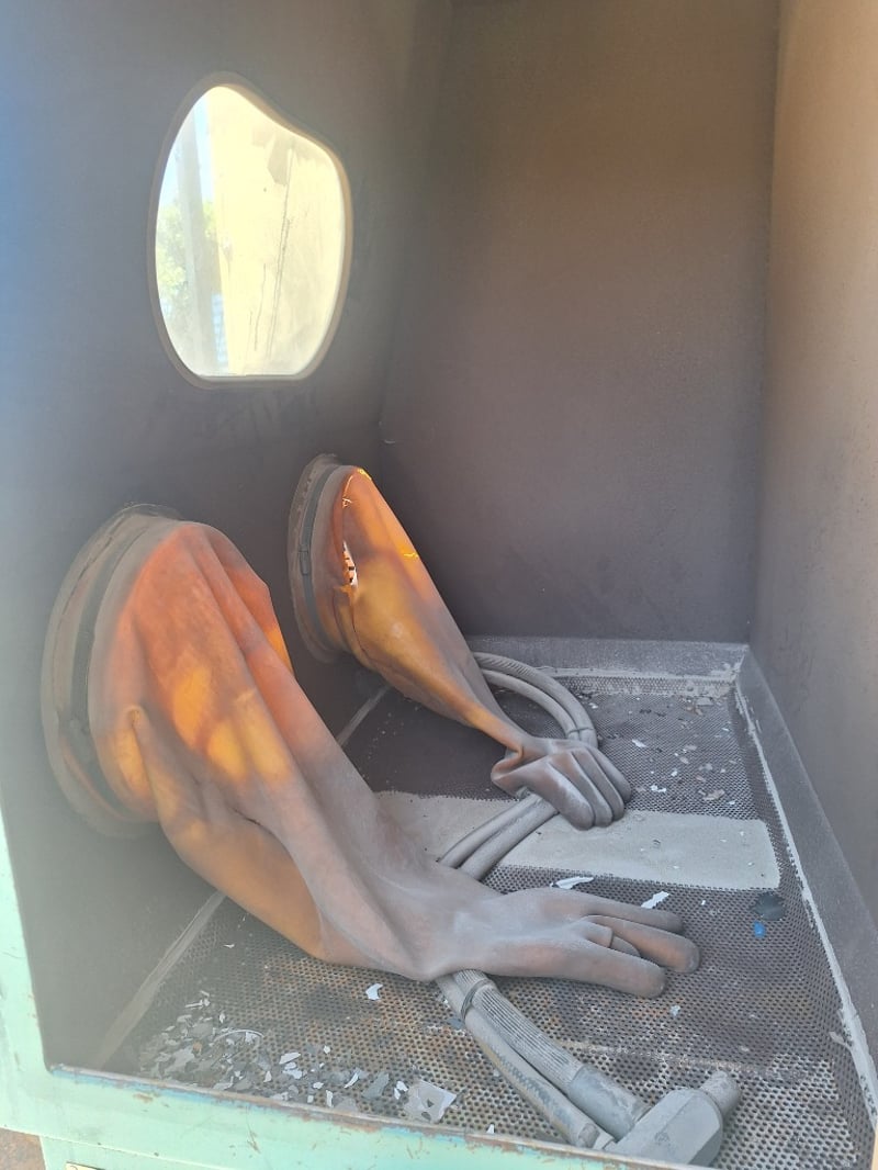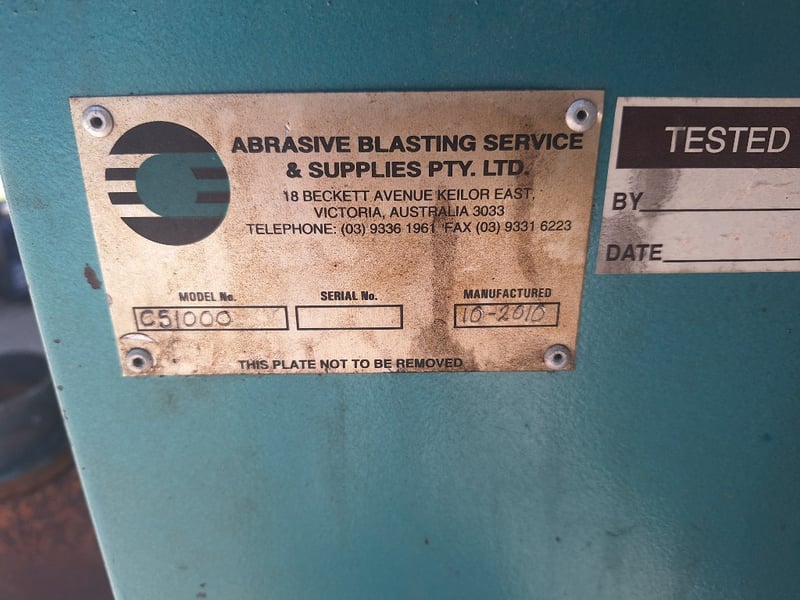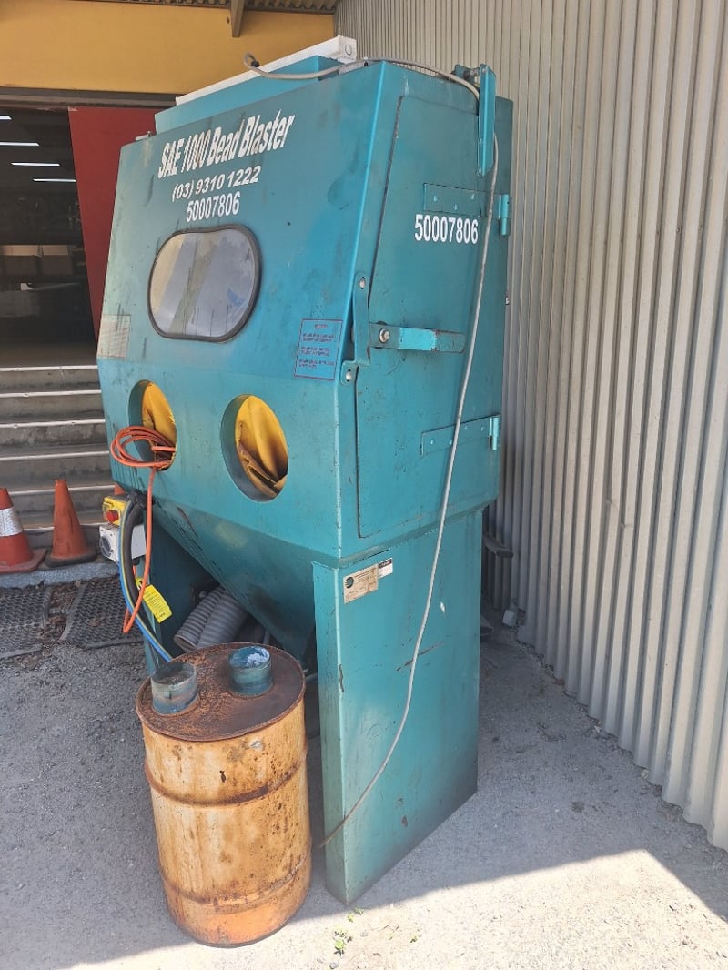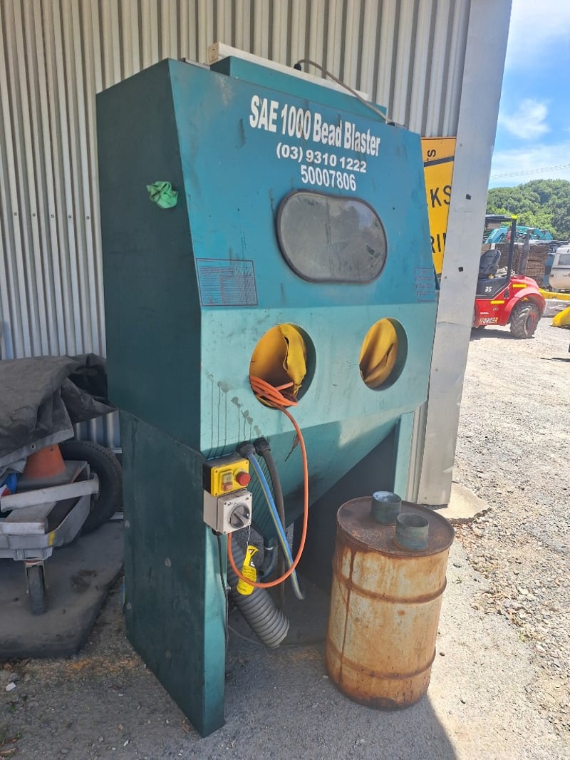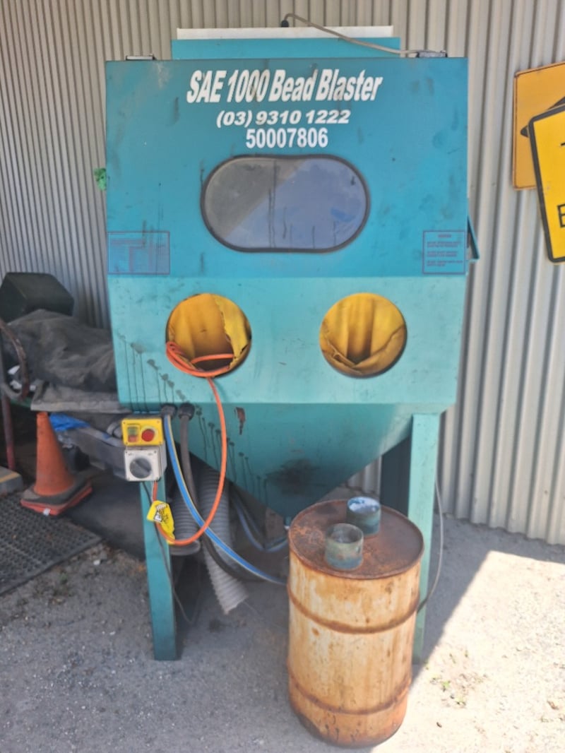 Description/Extras: SAE 1000 Bead Blaster, Pedal Control, E-Stops, Dust Control Unit And Hose, Approximately 1910mm (H) x 1010mm (L) x 600mm (D).