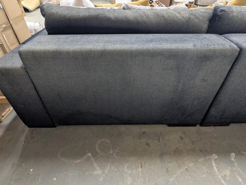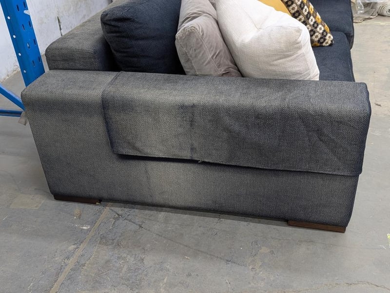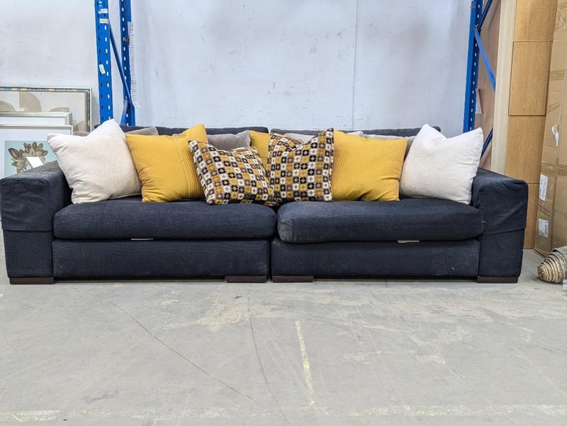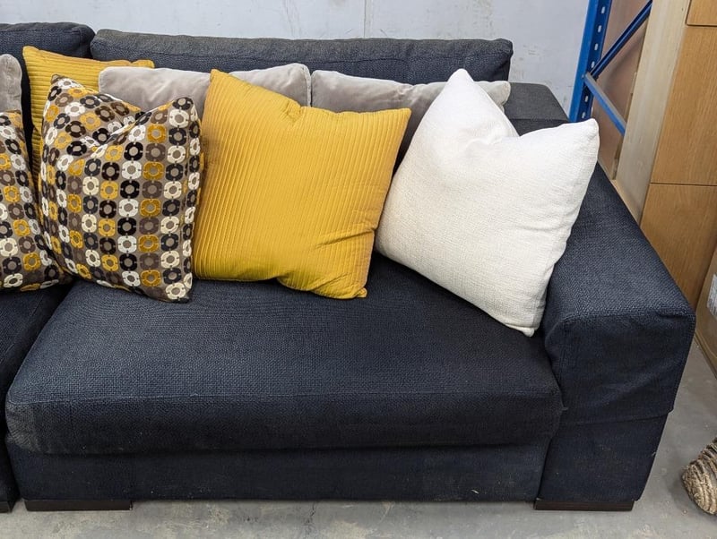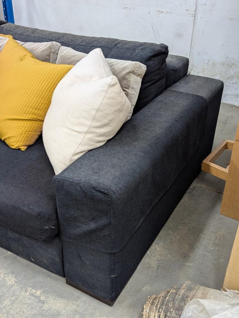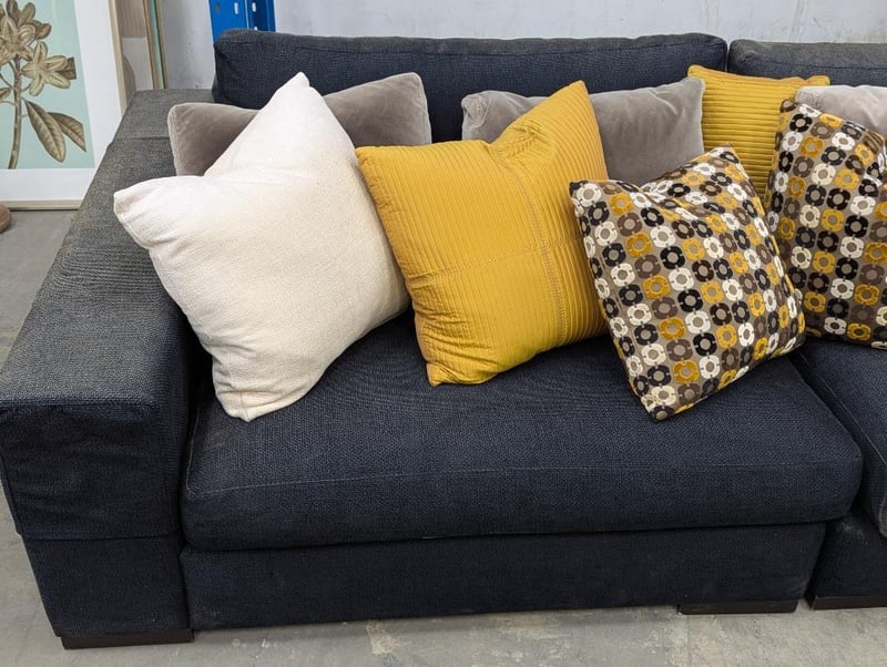 RRP $6500 Lounge Designer furniture, sectional couch, black finish material upholstery, arm rest covers either side, various coloured cushions