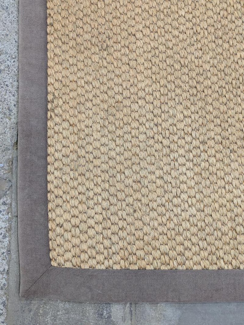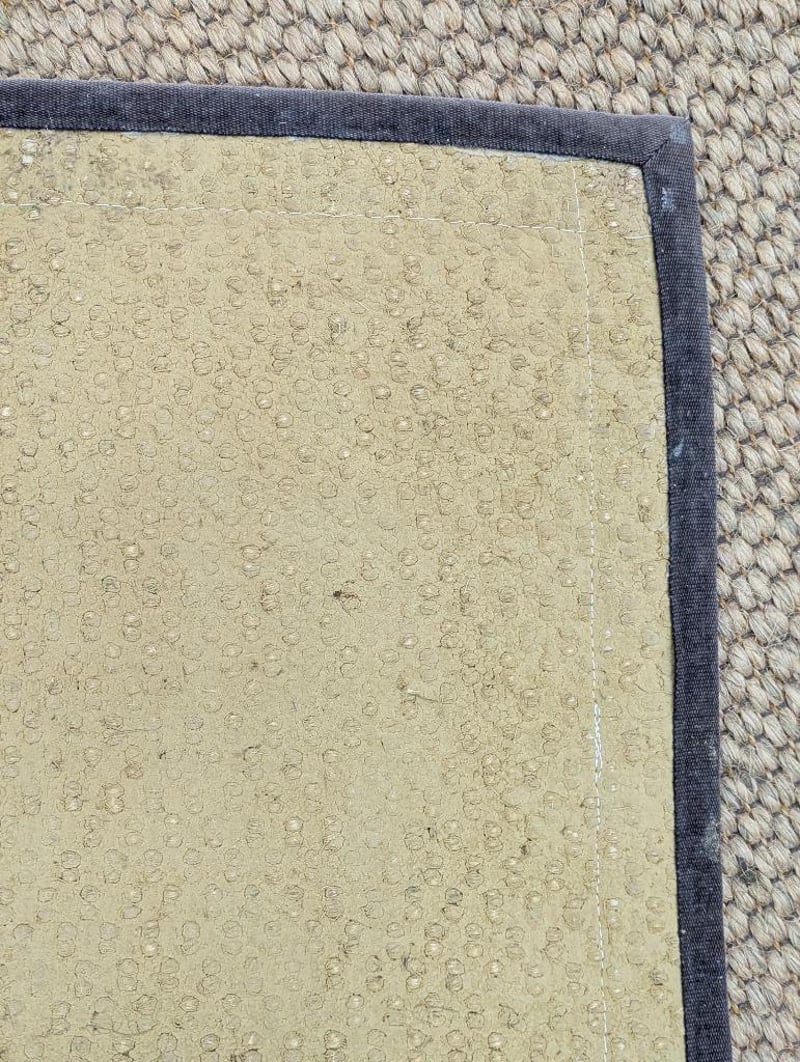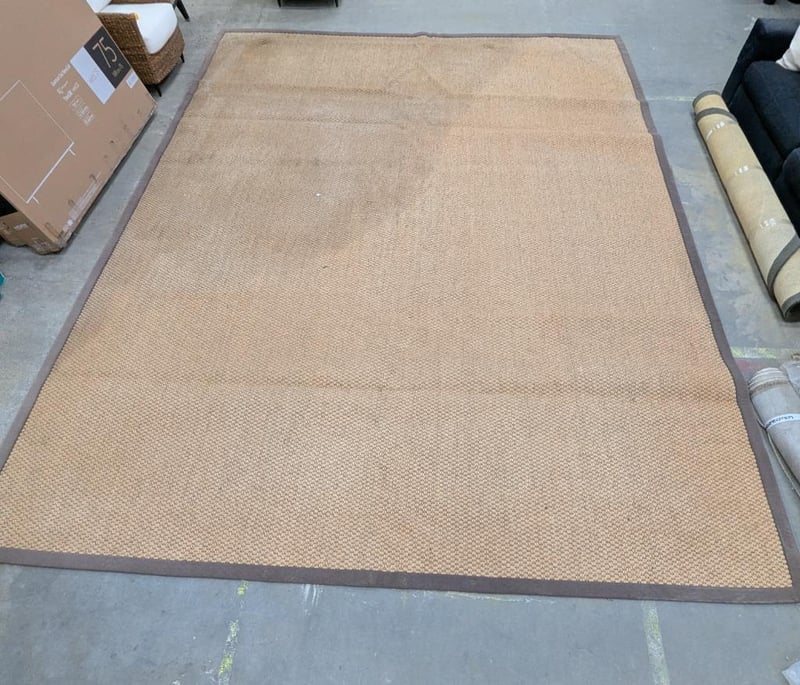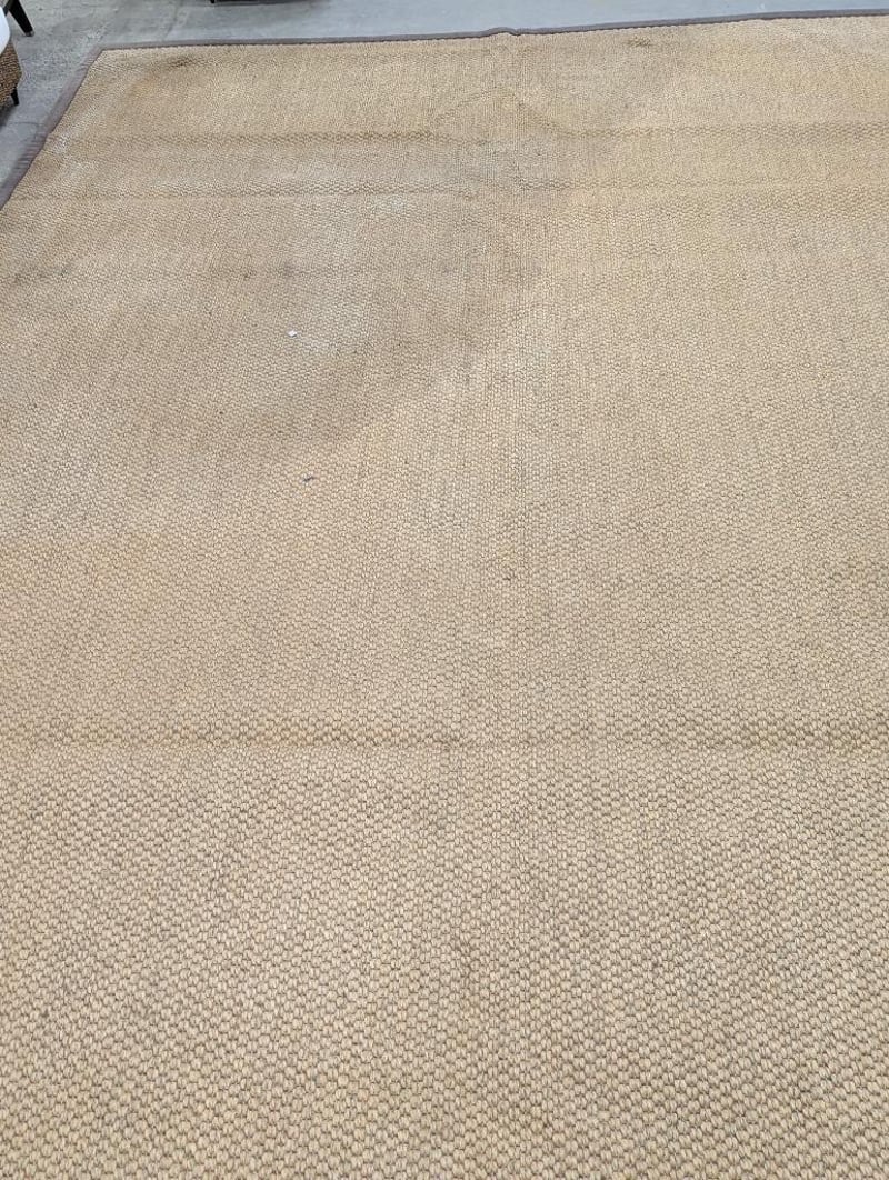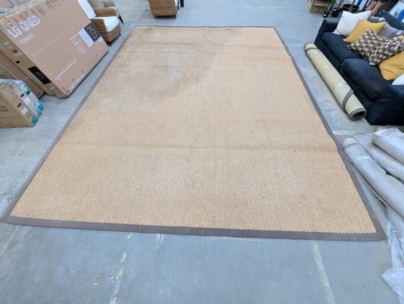 RRP $1,500 Floor rug, weave design with brown finish material edging, large stain visible Note: glass pieces in rug, rear of rug crumbly Dimensions: H 1cm x W 400cm x D 545cm