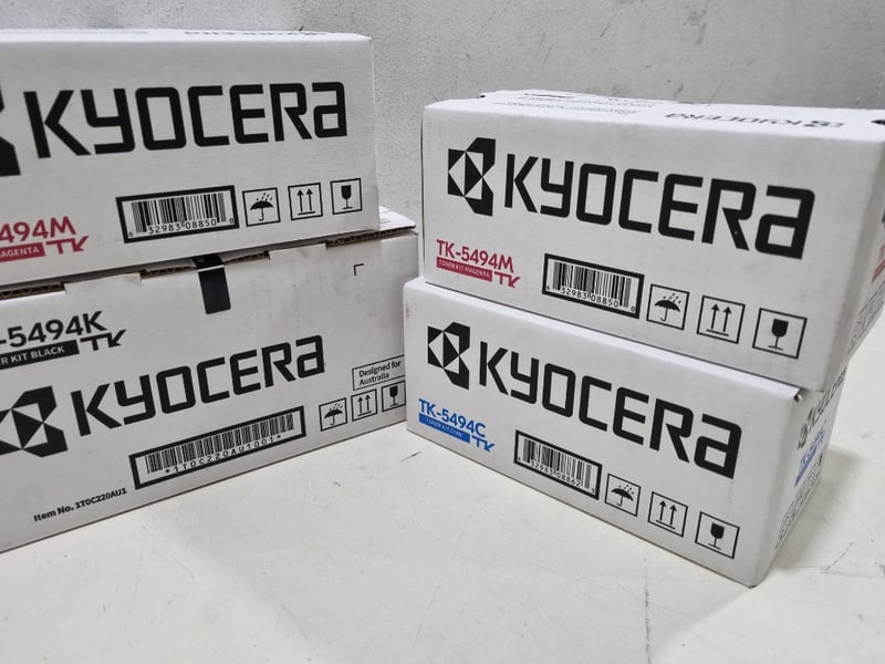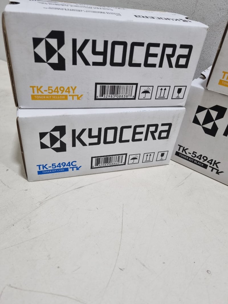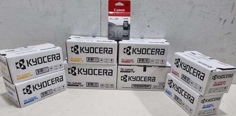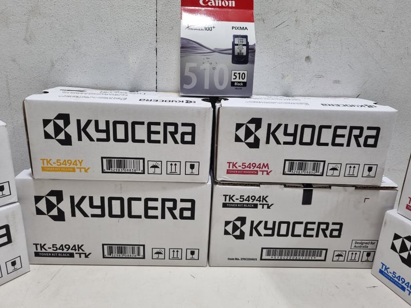 Bulk lot comprising Kyocera TK-5494 toner cartridge set including TK-5494K (black), TK-5494Y (yellow), TK-5494M (magenta), and TK-5494C (cyan). Original manufacturer toner kits designed for Kyocera ECOSYS printers. Includes bonus Canon PIXMA PG-510 black ink cartridge.